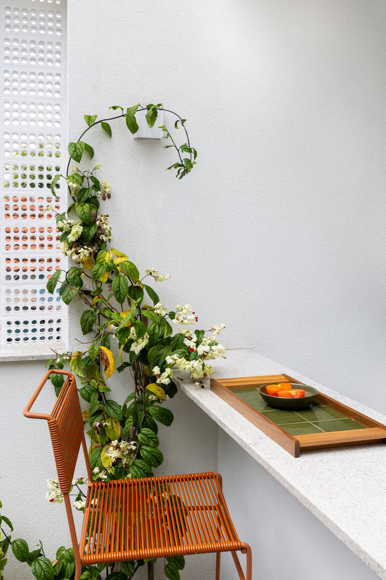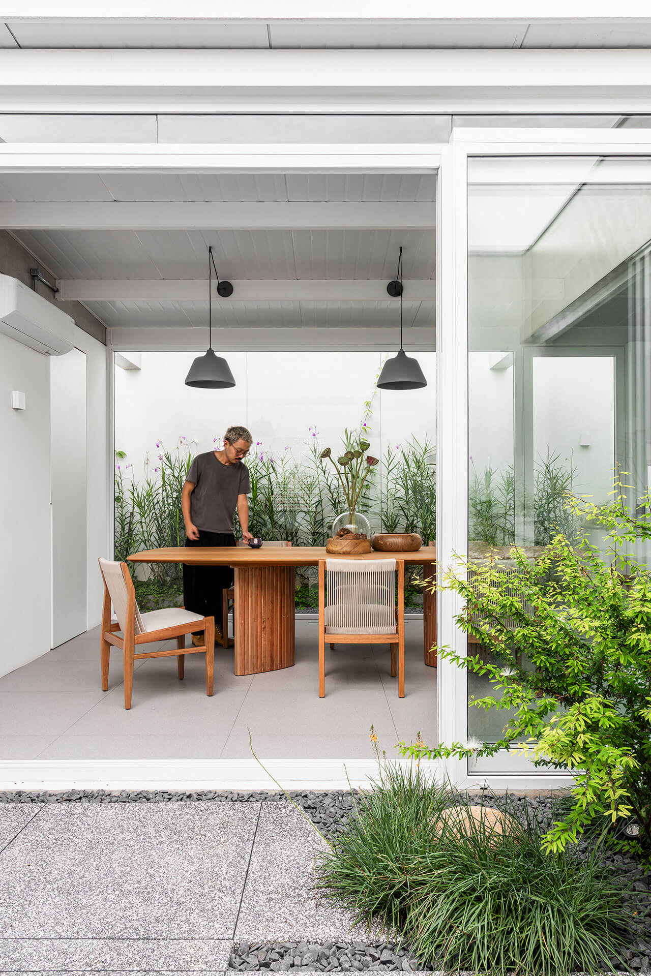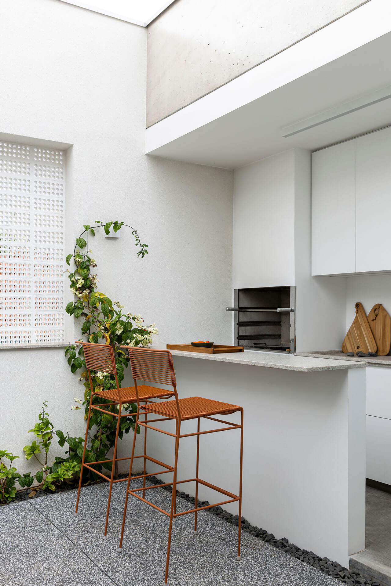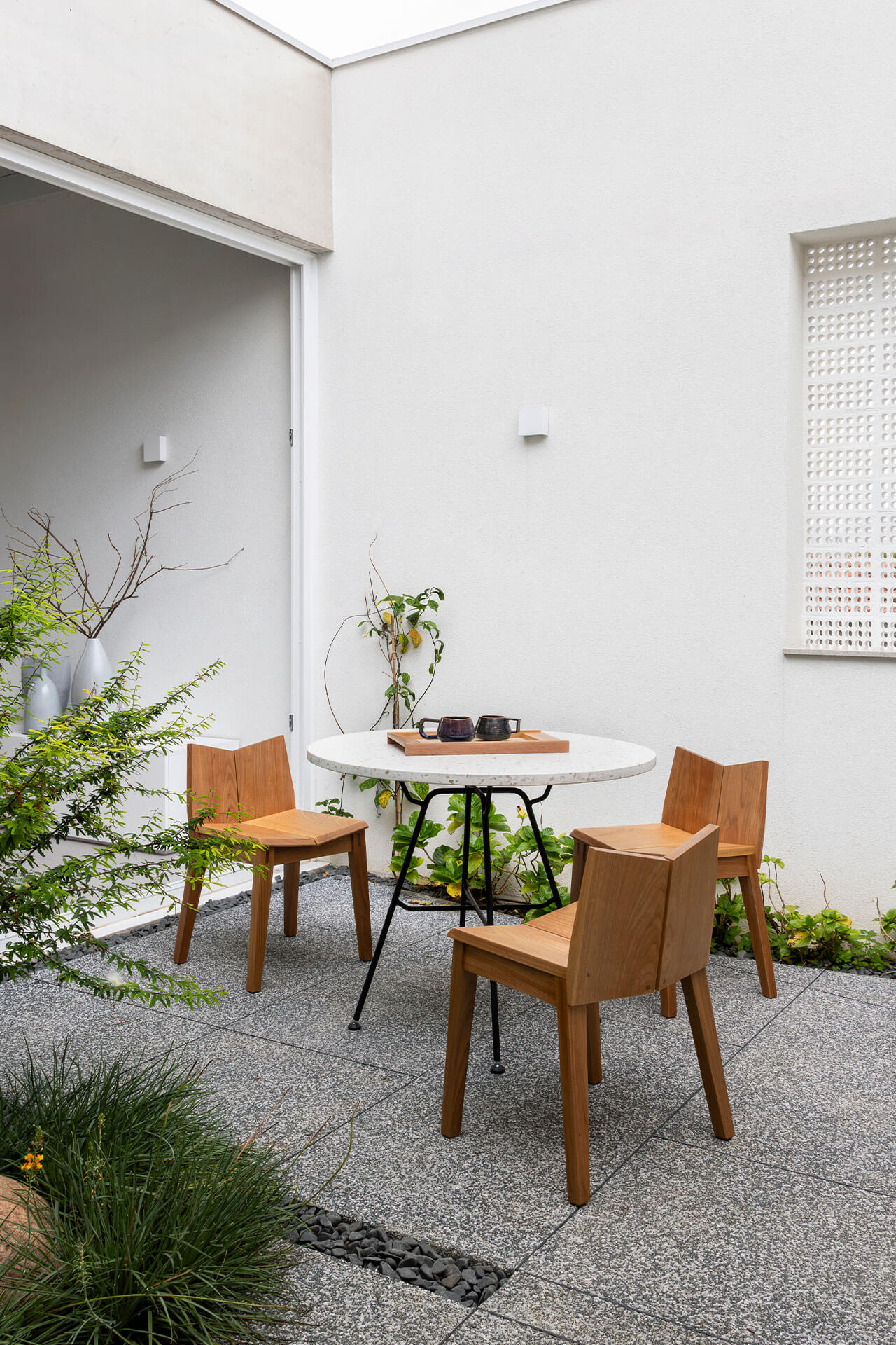A Casa Yano é toda integrada – sala, cozinha, área da churrasqueira e jardim de inverno. Para valorizar o minimalismo da cozinha e sala de estar, pensamos em peças sofisticadas e com traços inusitados, como a Mesa Enseada e Cadeiras Kinzo.