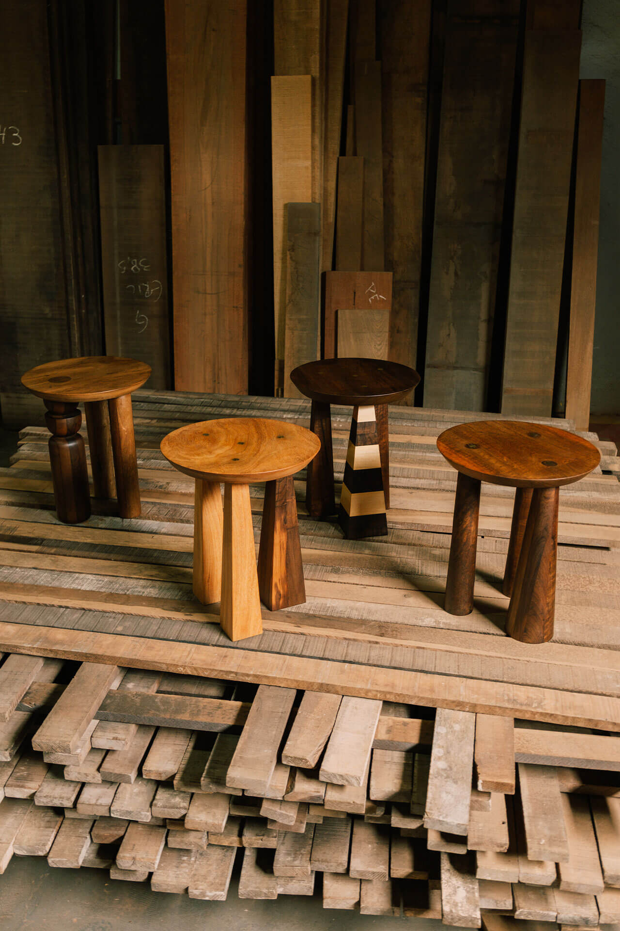 Produzidas em madeira maciça nobre, as mesas – Broto, Cone, Listras e Pirâmide – se diferenciam pelo desenho da base. A assimetria intencional dos pés, com um apoio em destaque, confere identidade e presença escultórica a cada peça. Algumas versões contam ainda com detalhes em latão maciço, acrescentando um contraste refinado ao conjunto.