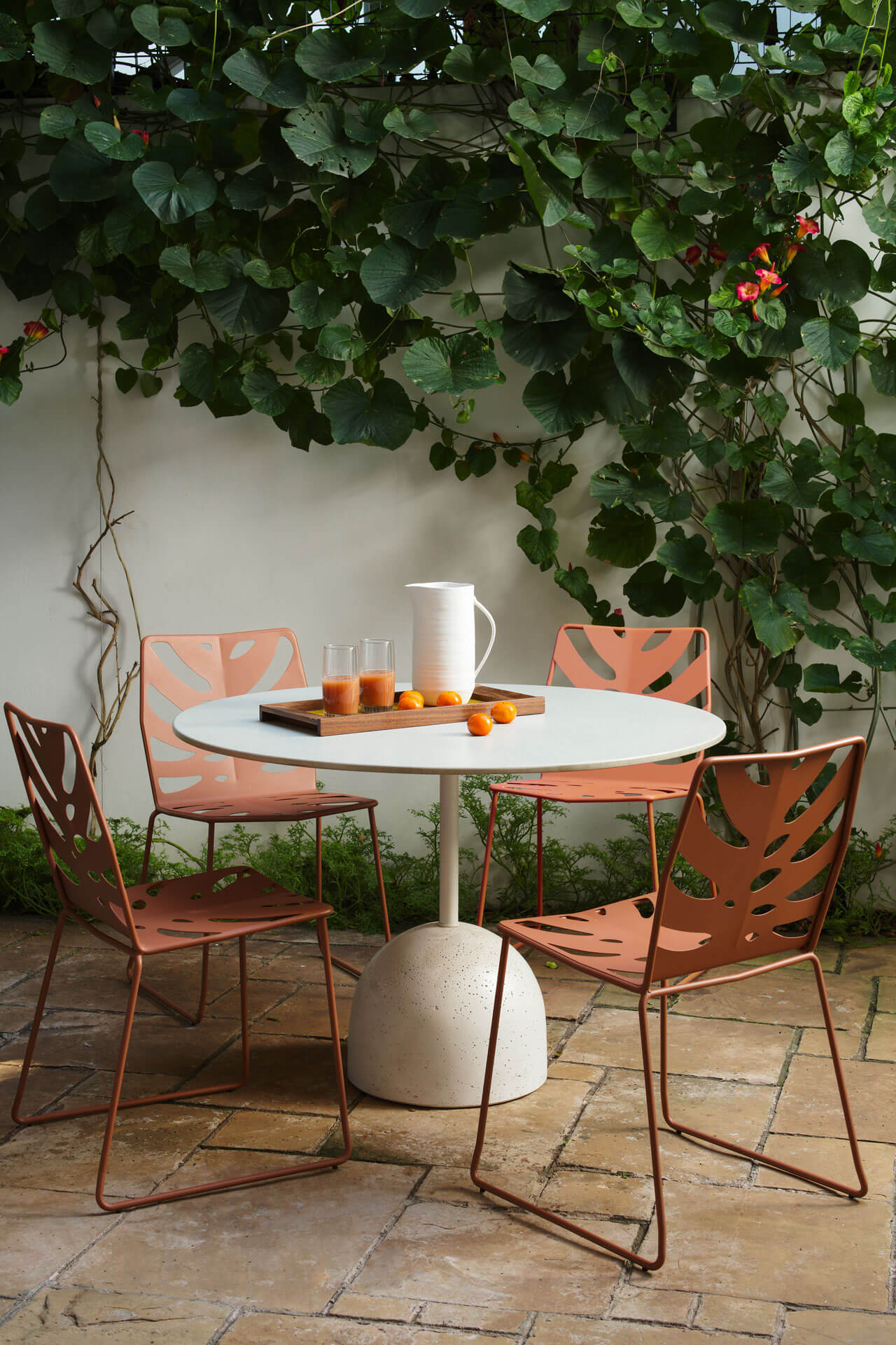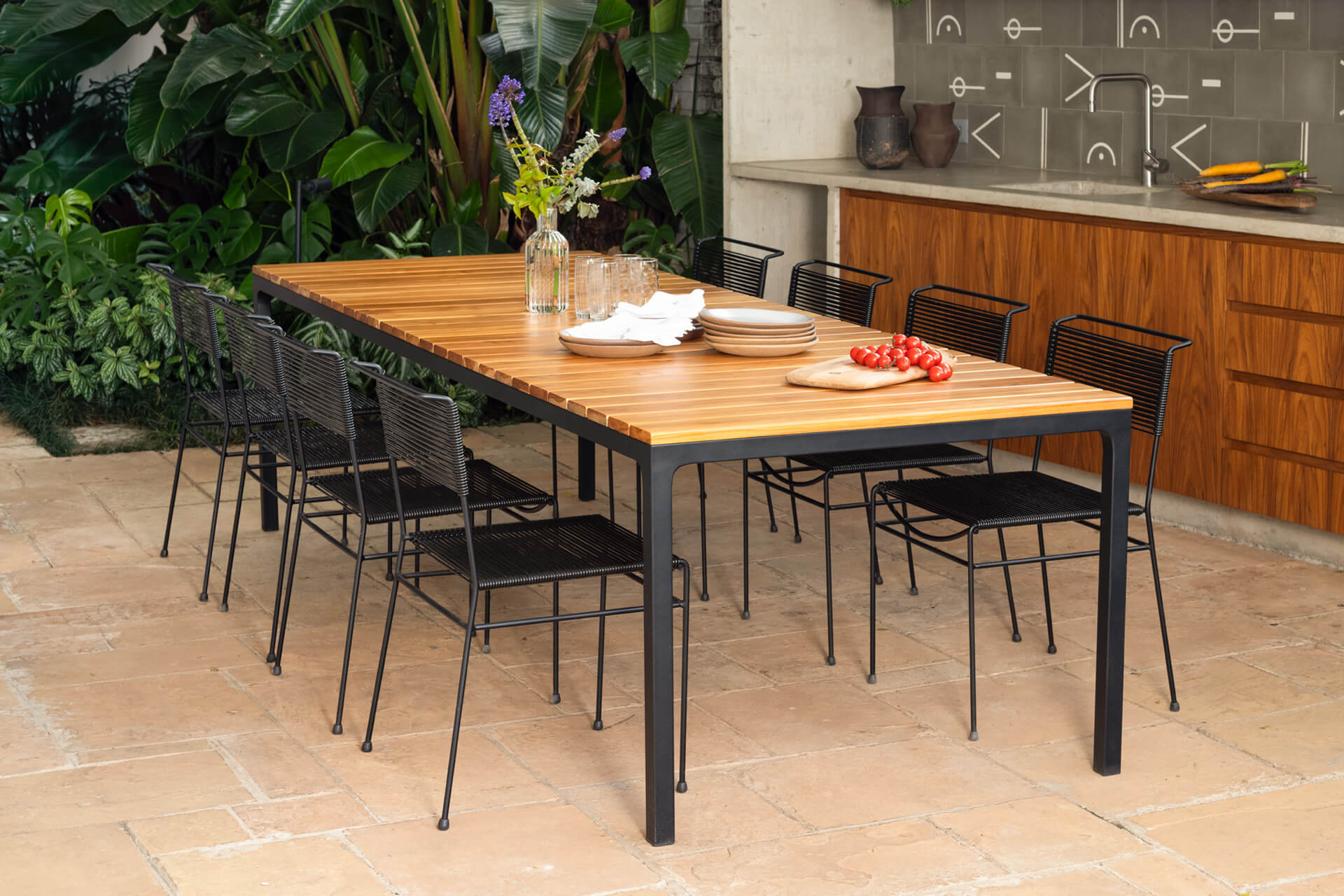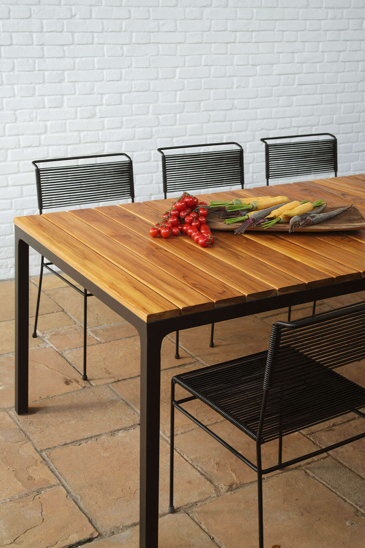 A Cadeira Spaghetti, um clássico da marca FJ Pronto pra Levar! está em linha há mais de 36 anos. Junto a ela, a Mesa Loft é um coringa e aqui foi feita com tampo ripado em madeira maciça. O Carrinho Salsa, uma peça versátil, serve de apoio para vários usos sem perder o charme.