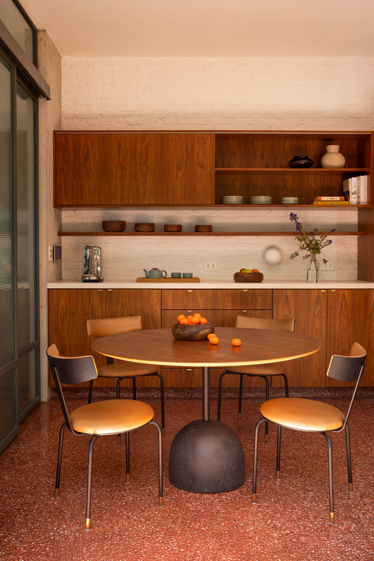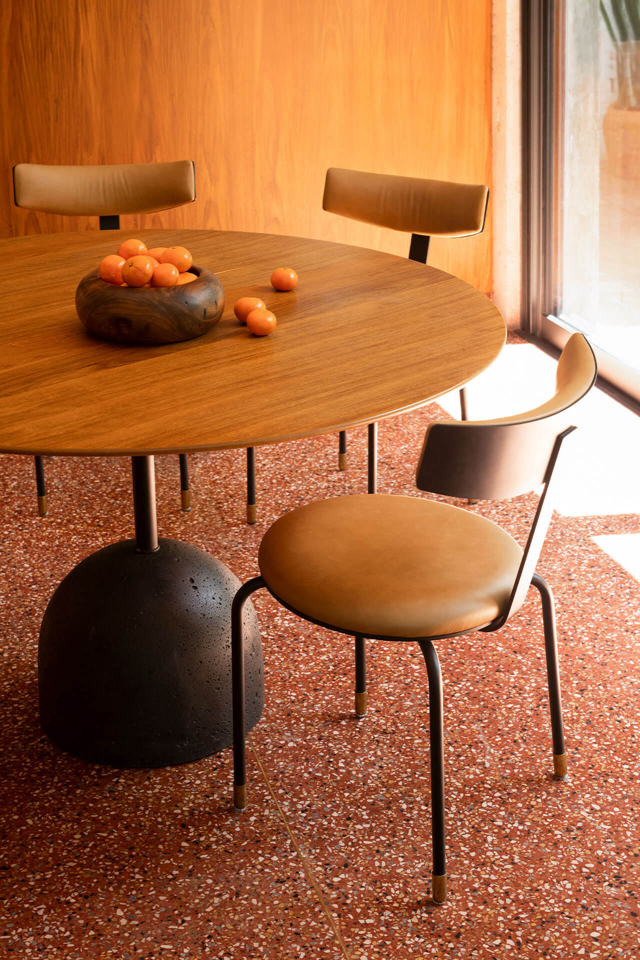 A cozinha é marcada pela sua arquitetura nada óbvia, com seu chão de granilite bordô e sua marcenaria escura. Para deixar o ambiente ainda mais especial e aconchegante, a Mesa Urca Madeira foi a escolha ideal. Seu tampo em teca maciça e nogueira laminada dialoga com o couro estofado e design minimalista das nossas cadeiras Te.