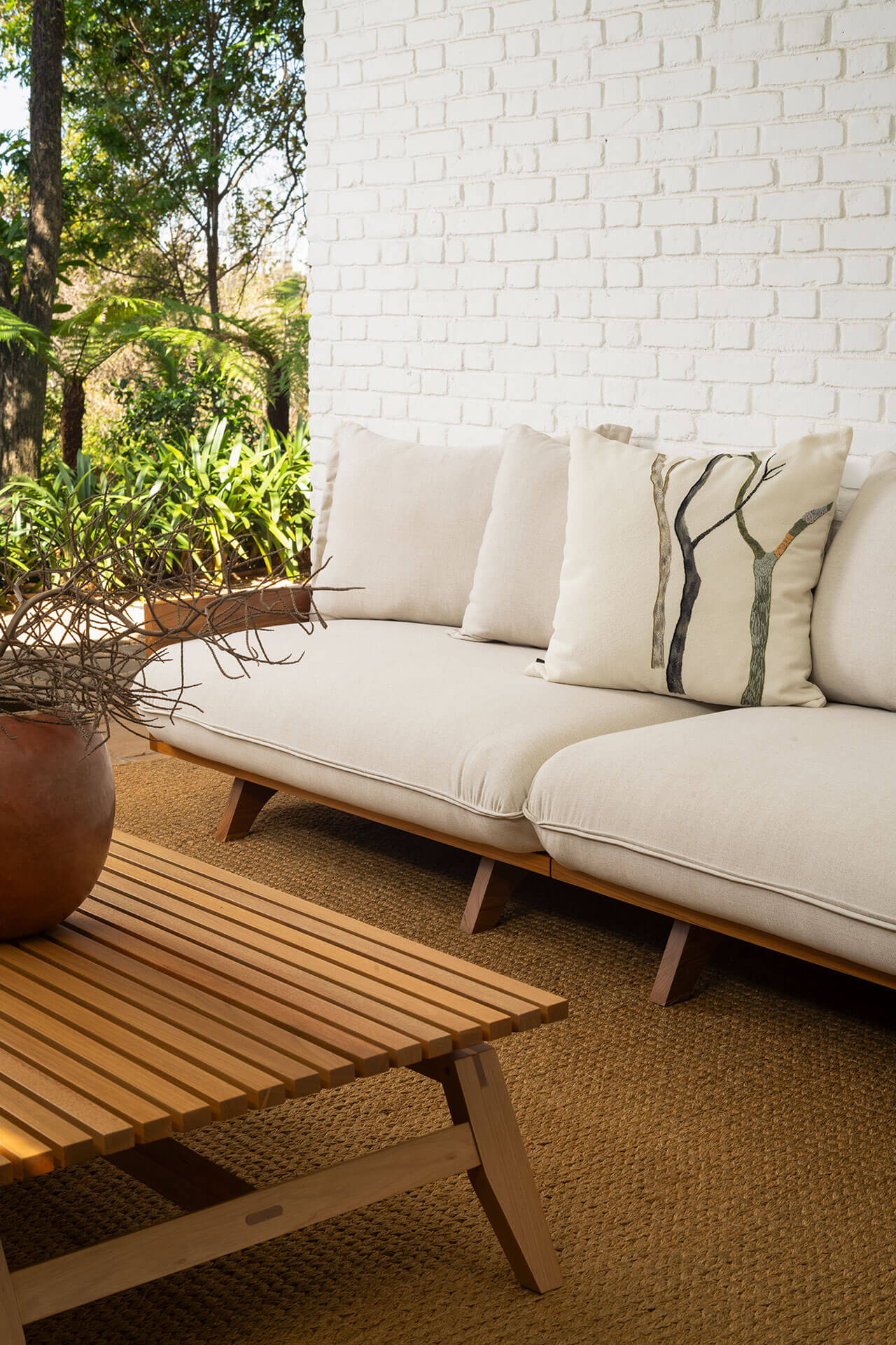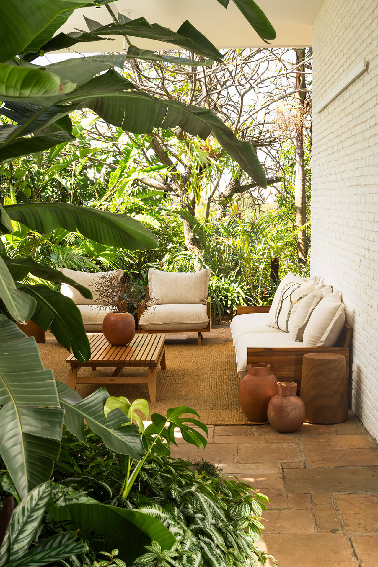 Uma área de lazer convidativa e confortável onde os móveis foram pensados para serem bastante usados sem exigir grandes preocupações.