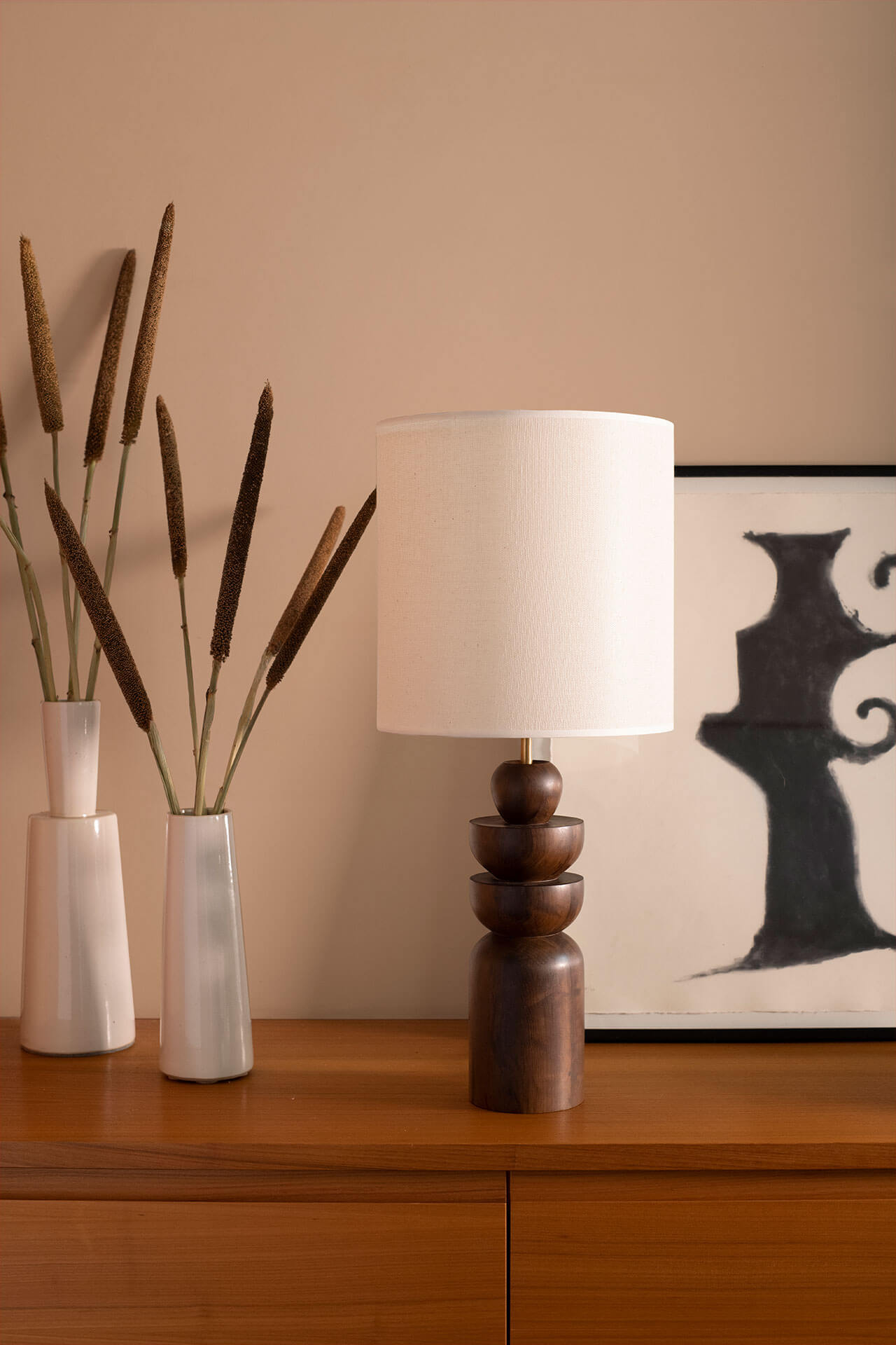 Base torneada em madeira maciça nobre e cúpula em tecido liso, com fechamento em polipropileno.