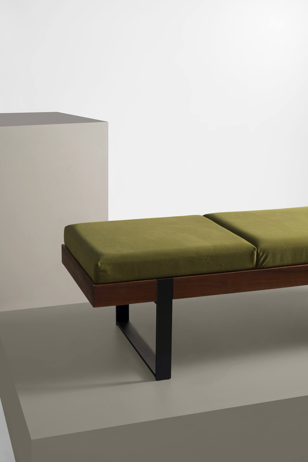 O charme da nova versão do banco Pilar se dá pelo generoso rodapé de madeira que envolve os gomos do estofado. Ele pode ser feito em madeira maciça de Imbuia ou em MDF laminado em outros tipos de madeira natural.