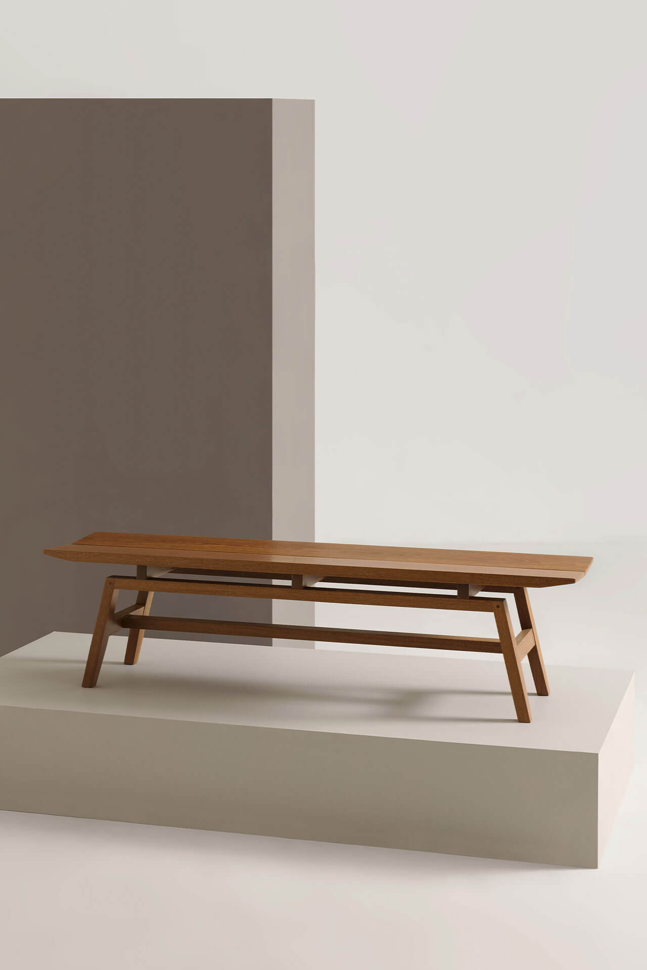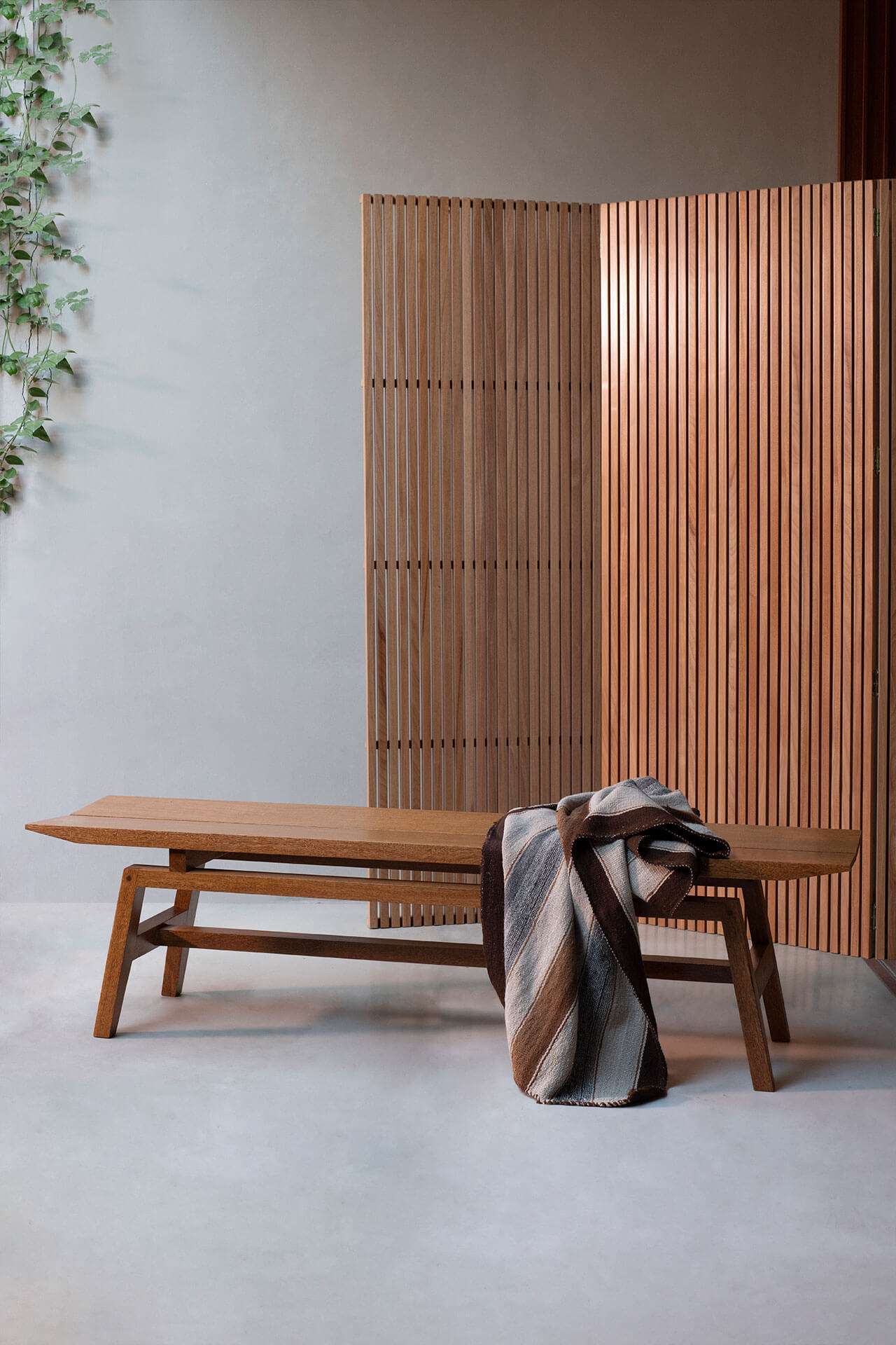 O Torii é um banco com encaixes aparentes que valoriza o uso da madeira maciça natural e as técnicas de marcenaria requintada. Seu assento, que parece flutuar, possui um chanfro acentuado nas extremidades e um delicado vão entre as duas pranchas. Seu desenho remete ao portal dos santuários japoneses, chamado Torii.Conheça também o Aparador Torii.