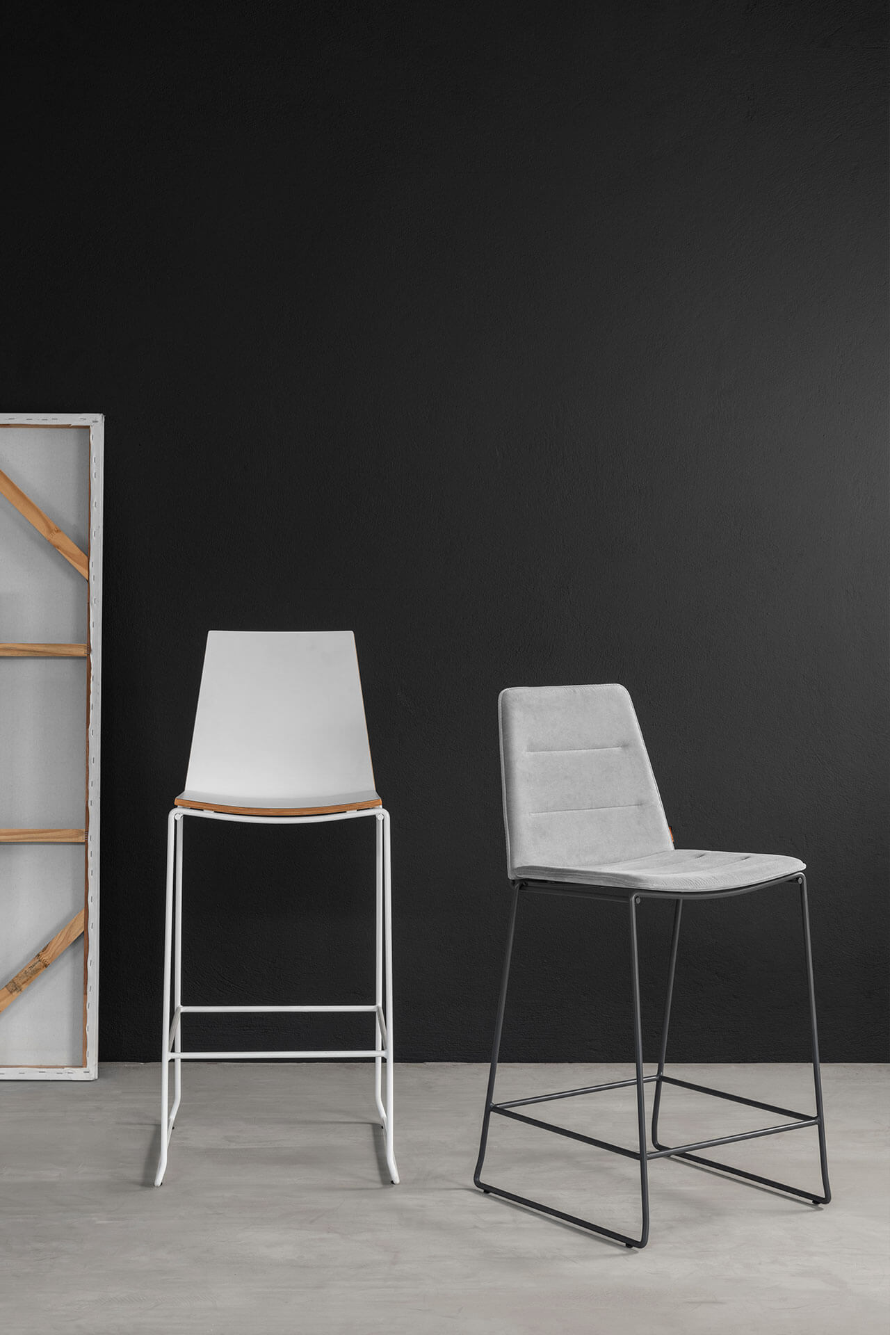 Estrutura em aço maciço trefilado com pintura a pó em cores diversas. Assento e encosto estofados em diversos tecidos.