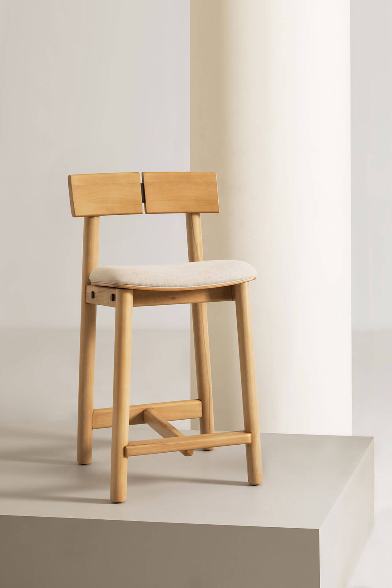 Estrutura em madeira maciça com verniz poliuretano. Assento estofado em diversos tipos de tecido.