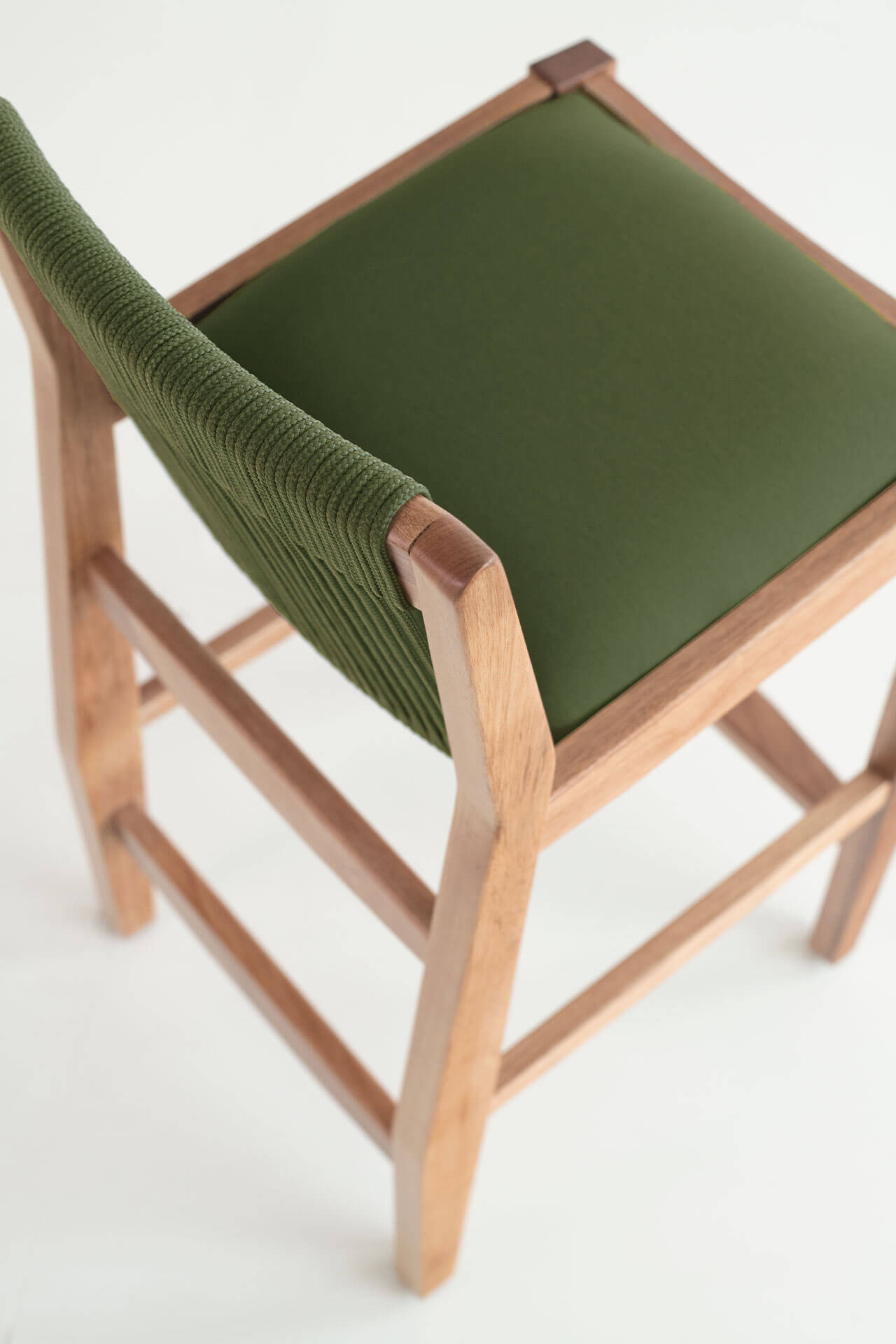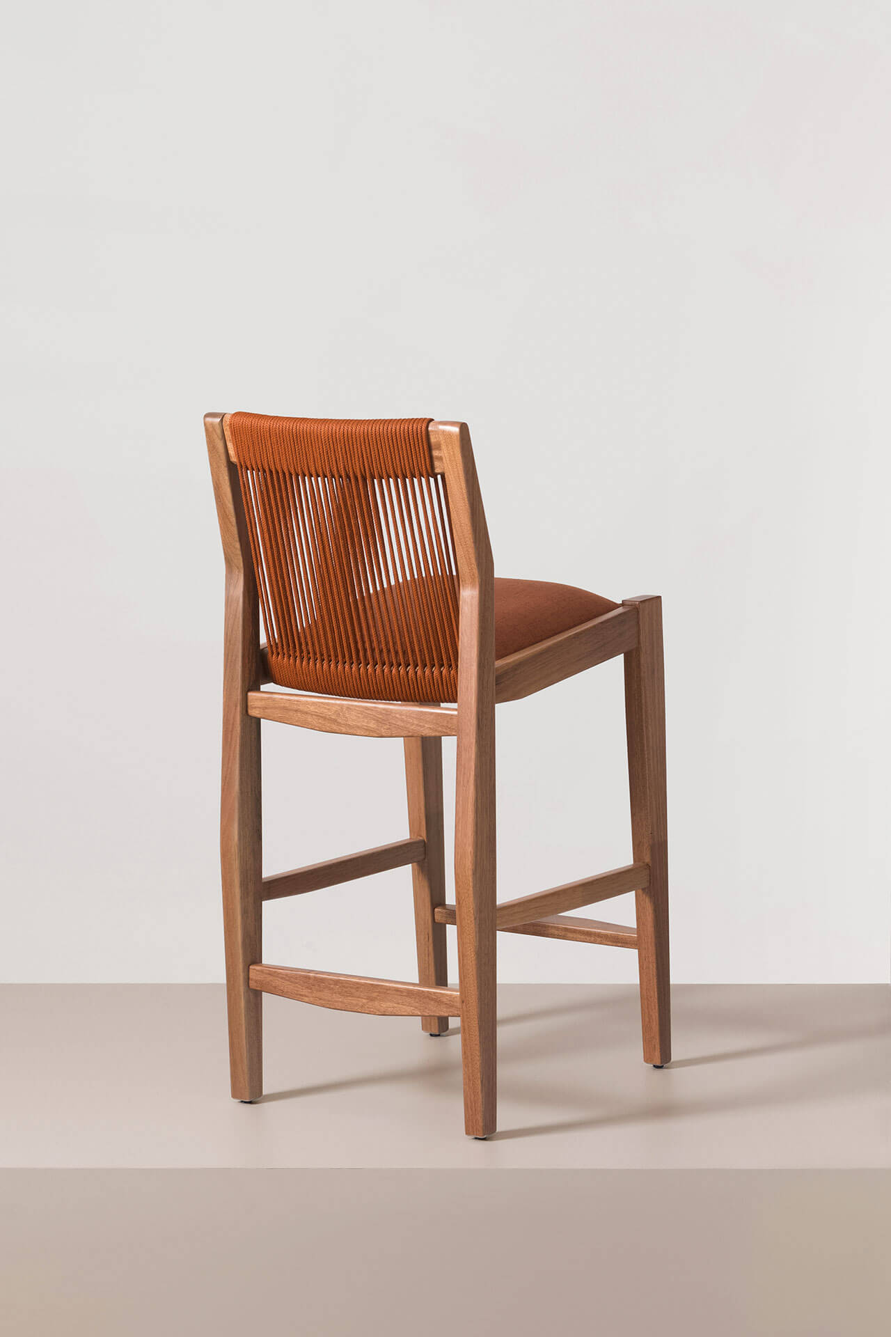 A Cadeira Nau Alta nasceu do desenho das cadeiras de mesmo nome. Com estrutura em madeira maciça, recebe em seu encosto um trançado manual com corda náutica que dá destaque à peça. Seu assento estofado, que pode ser feito em diversos tipos e cores de tecidos, traz mais conforto ao sentar. Pode ser usada em ambientes internos e externos cobertos. Disponível em duas alturas diferentes, média e alta, e é indicada para bancadas de 90 e 105cm, respectivamente.