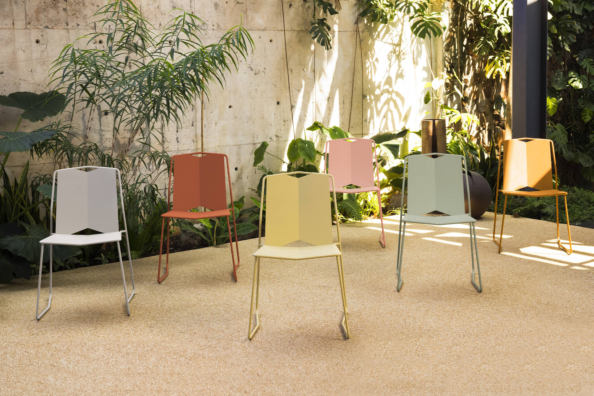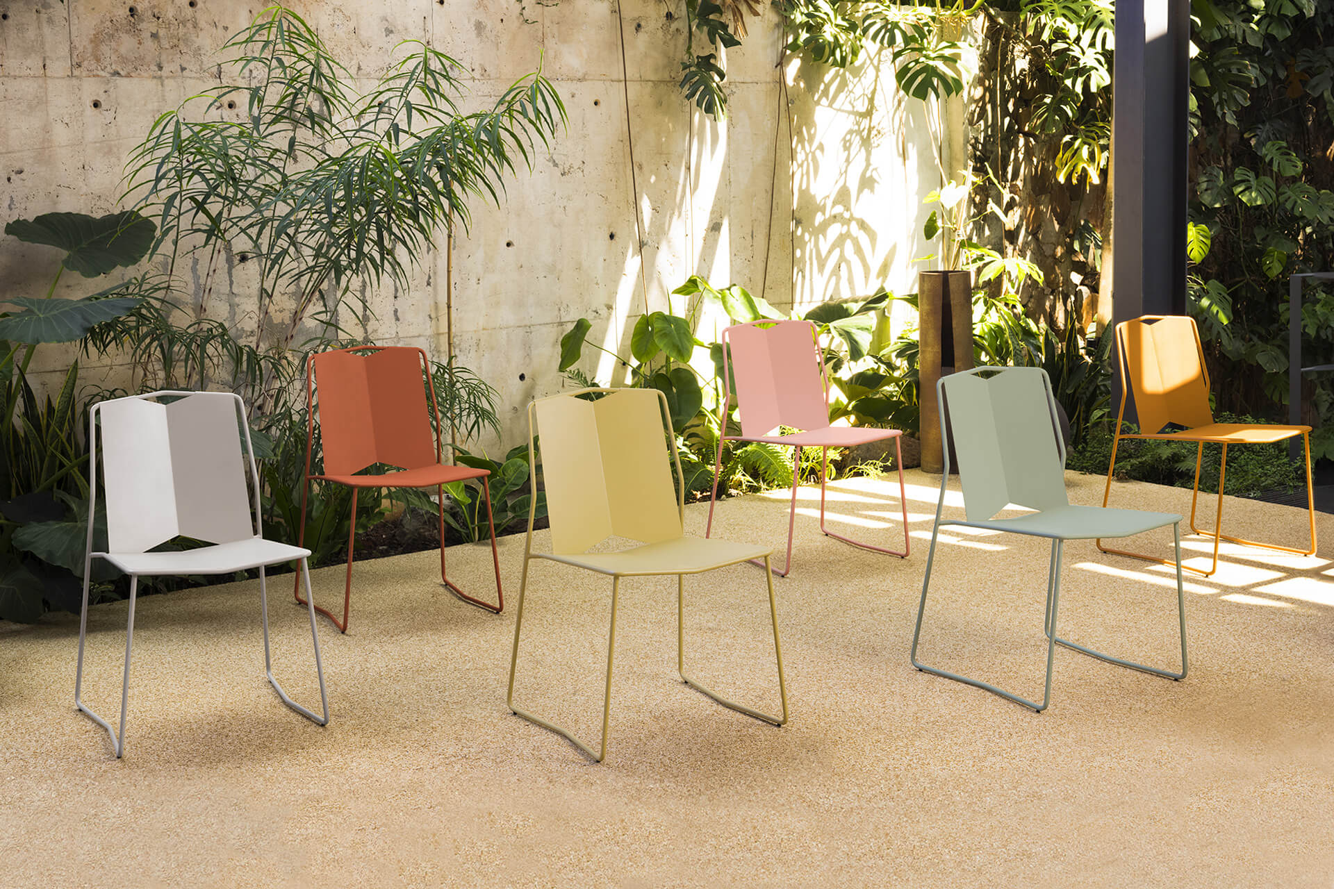 Estrutura em aço carbono e encosto e assento em chapa de aço carbono com pintura a pó em cores diversas.