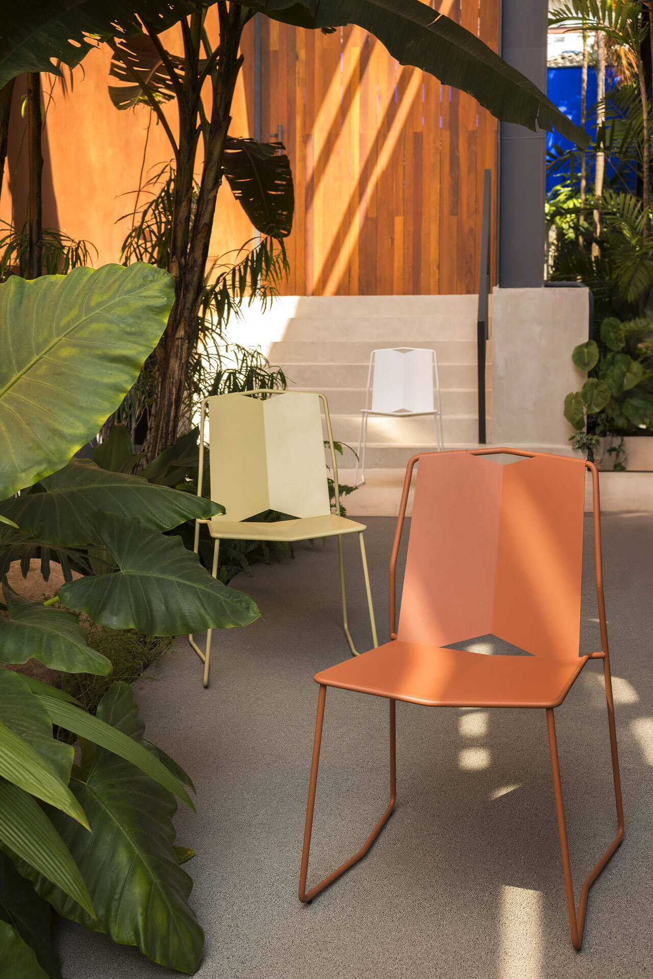 Estrutura em aço carbono e encosto e assento em chapa de aço carbono com pintura a pó em cores diversas.
