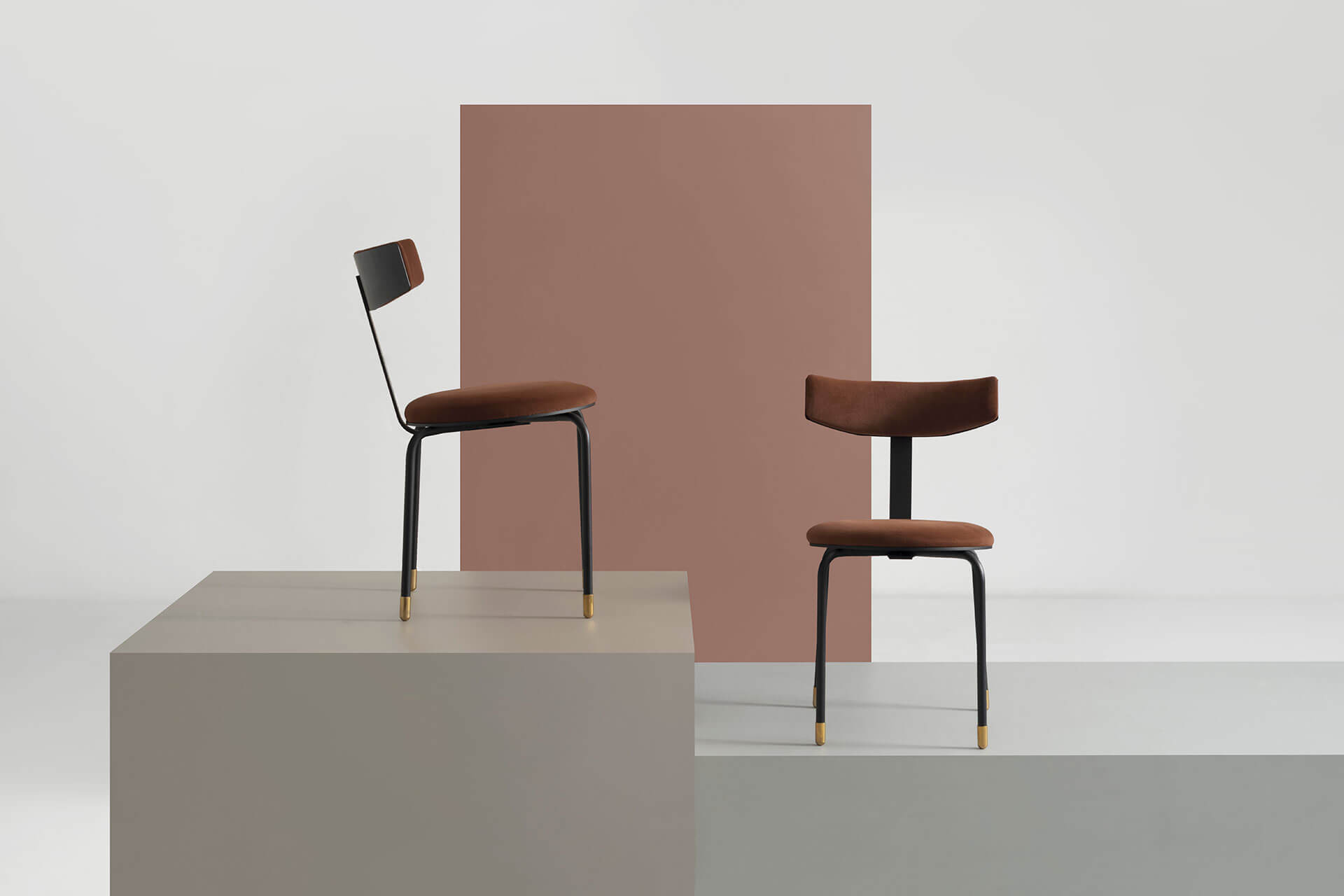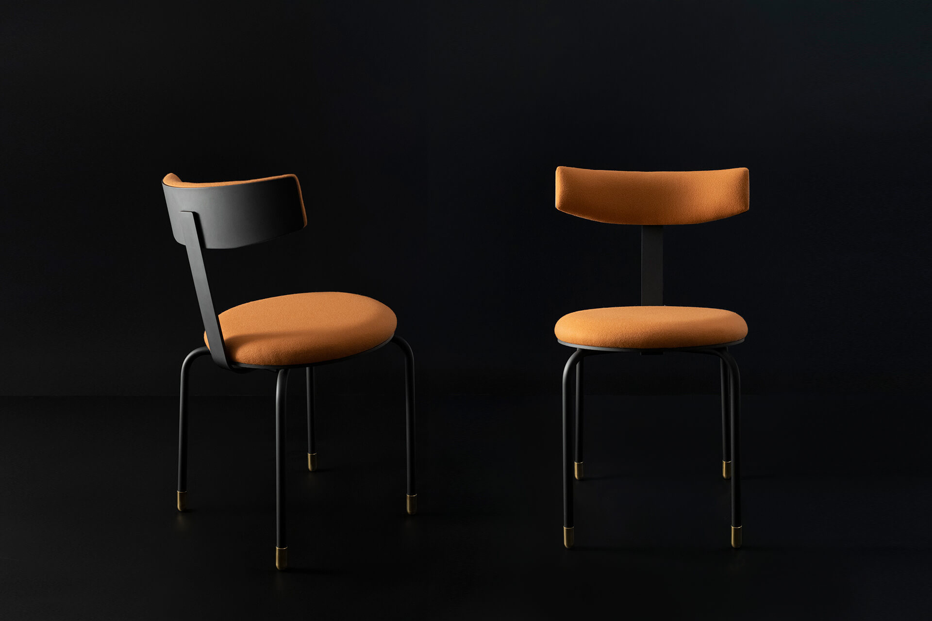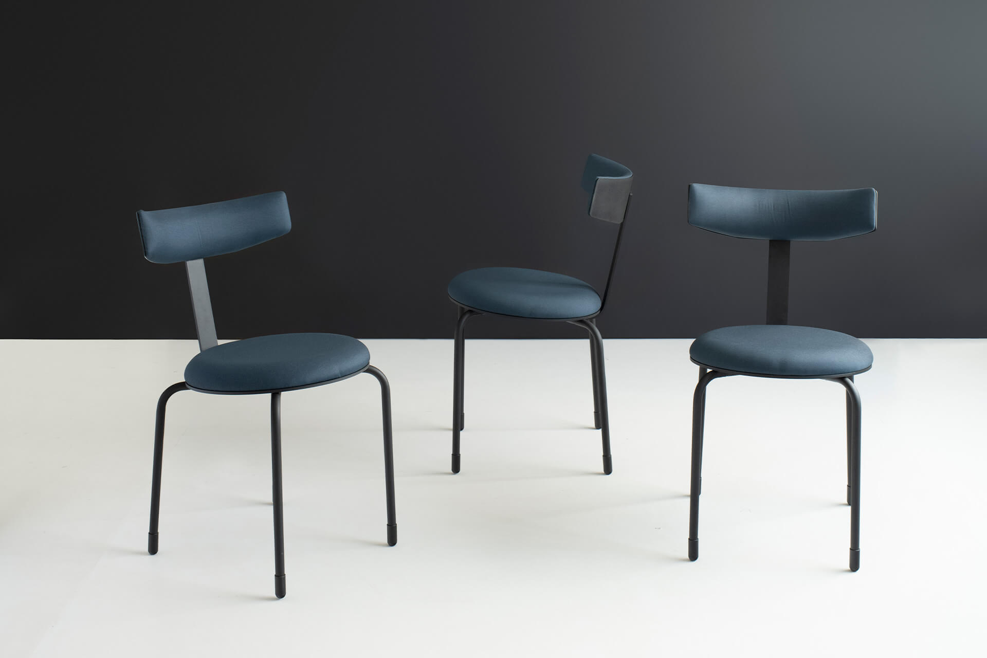 Estrutura em aço carbono e acabamento com pintura eletrostática a pó na cor preto ou gelo. Ponteiras dos pés em latão maciço ou aço carbono com pintura eletrostática a pó na cor preto. Encosto de chapa metálica com estofamento na parte frontal, revestido com tecido em cores diversas. Assento estofado com tecido em cores diversas.