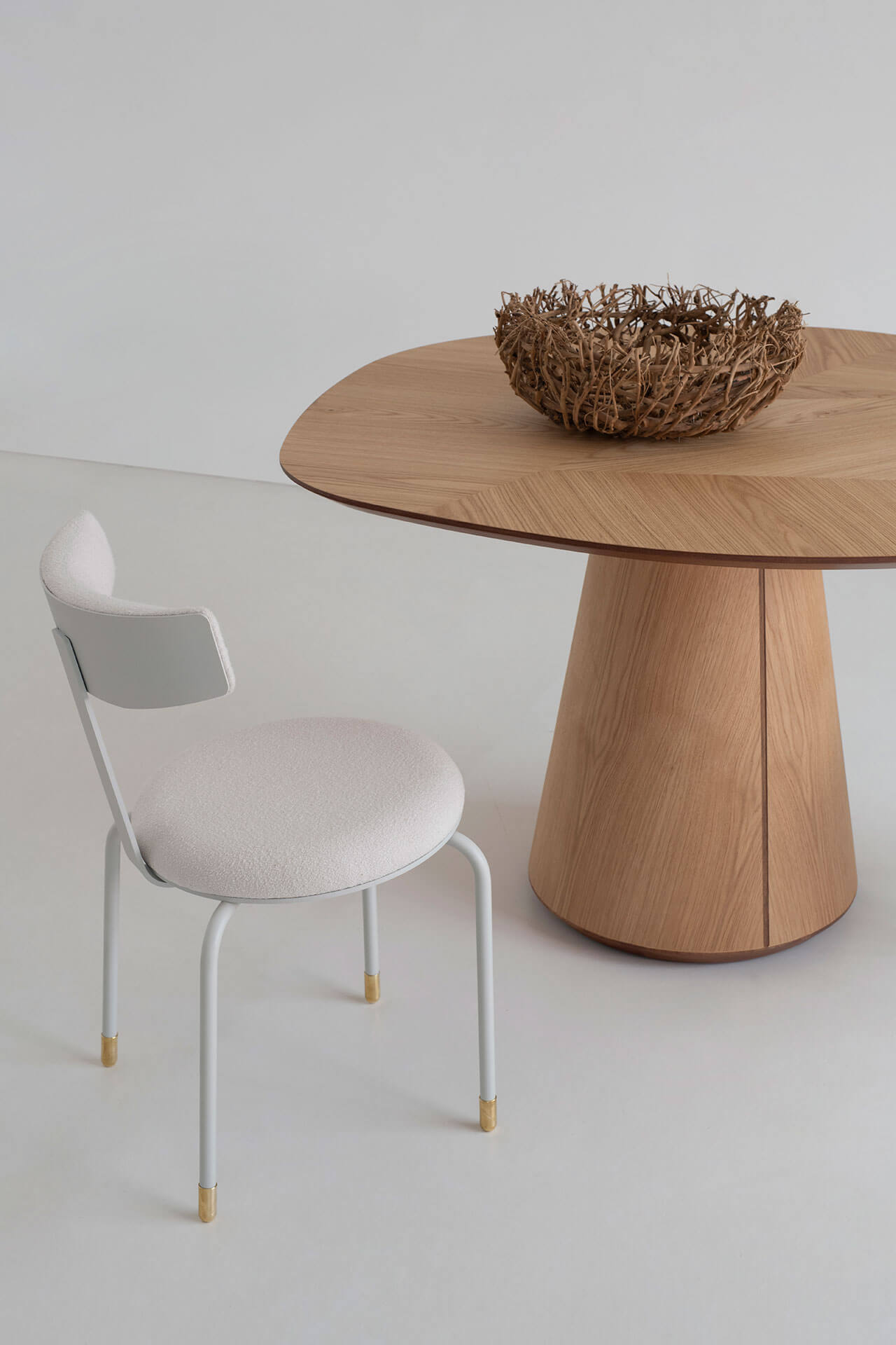 As formas minimalistas da Linha Te se destacam pelo primor dos detalhes, acabamentos e materiais minuciosamente selecionados. A Cadeira Te Estofada possui o assento redondo e o encosto curvado estofados. Conheça também sua versão com encosto de metal.