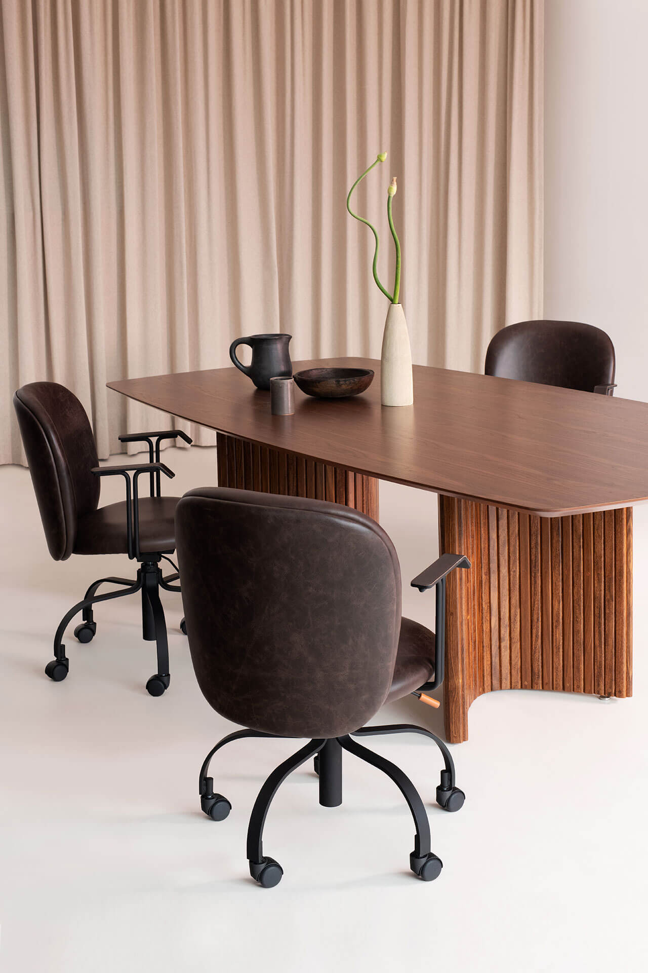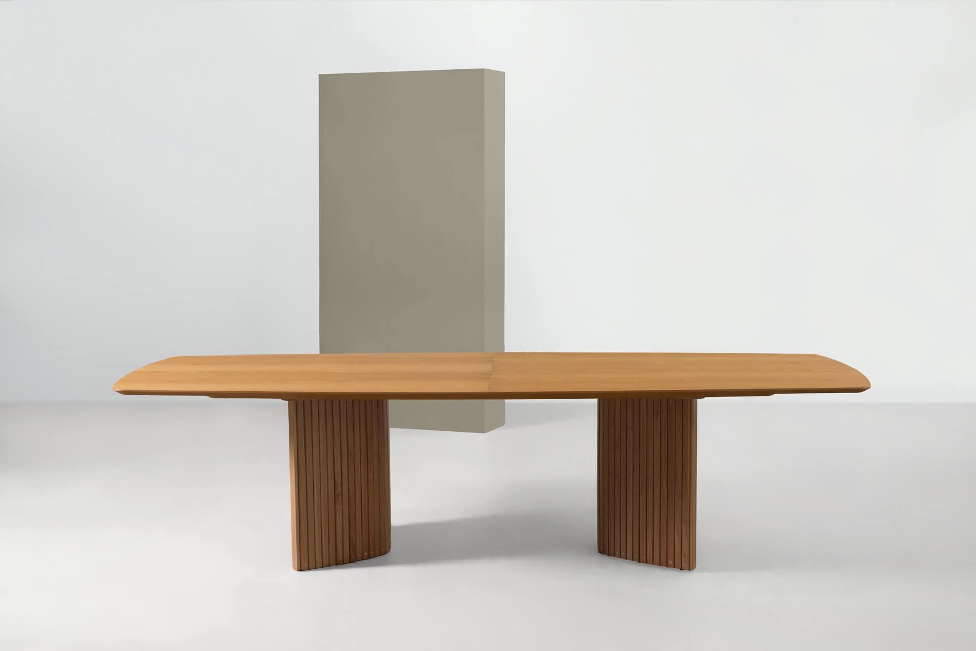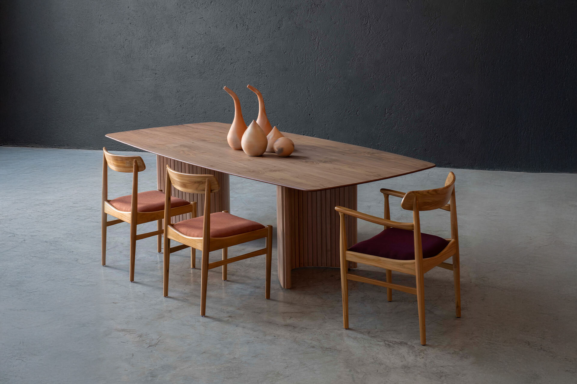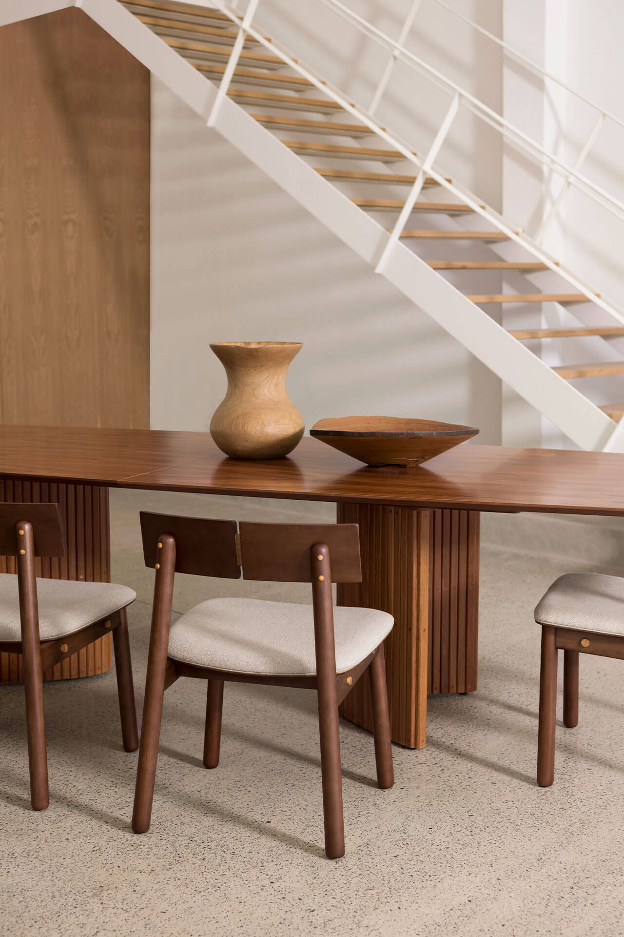 A Mesa Enseada foi projetada para ter dimensões maiores e priorizar a boa disposição de cadeiras. Possui duas bases feitas de ripas de madeira maciça com cavilhas aparentes, detalhes da marcenaria tradicional. Seu tampo laminado de madeira natural possui quinas arredondadas, deixando a peça mais leve visualmente. Disponível em duas composições de madeira, mais clara ou mais escura. Conheça sua versão com tampo quadrado.