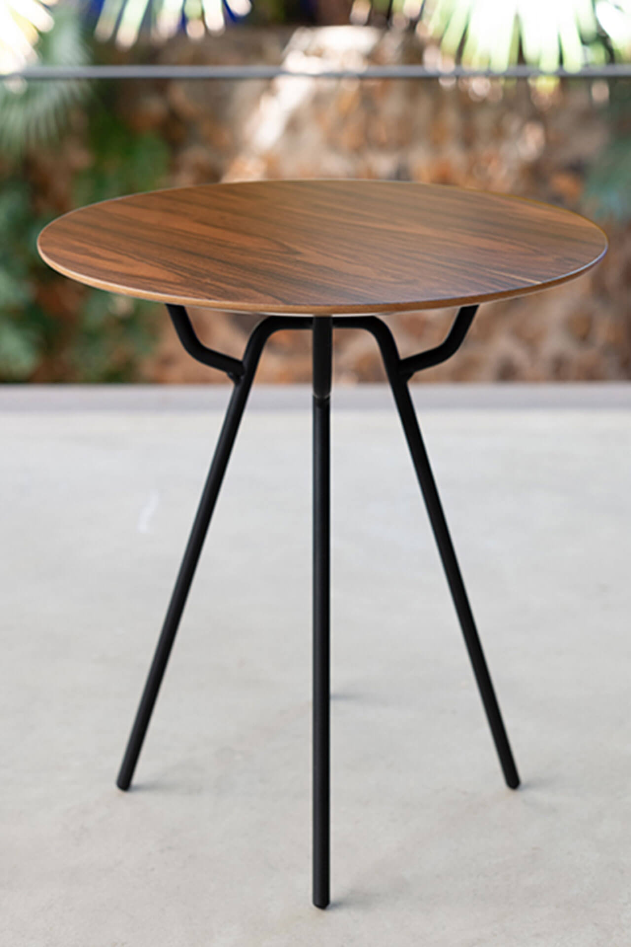 A Mesa Lateral Vírgula Madeira possui uma elaborada base feita em vergalhão maciço de aço carbono e tampo em madeira natural.