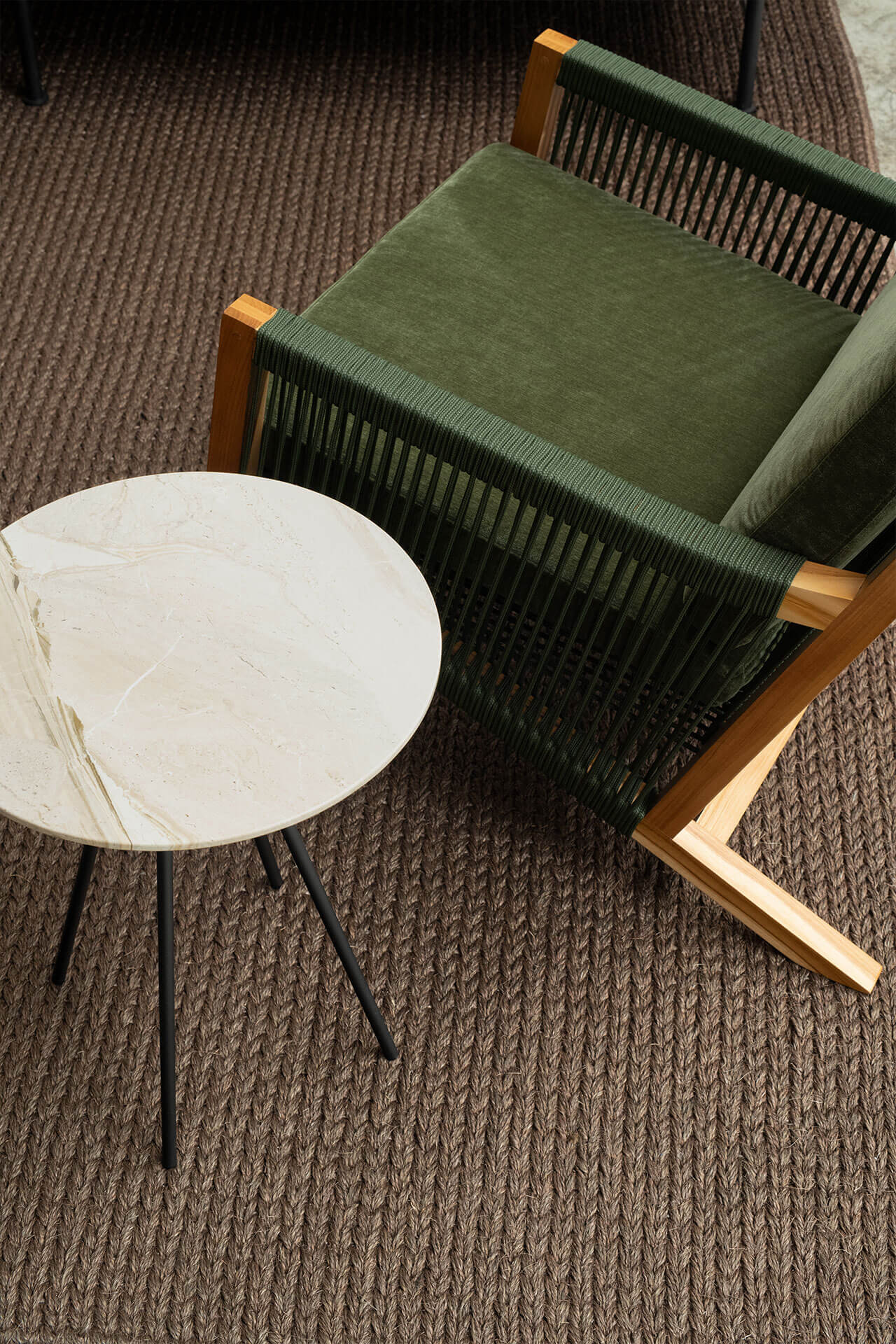 A Mesa Lateral Vírgula Mármore possui uma elaborada base feita em vergalhão maciço de aço carbono e tampo em mármore.