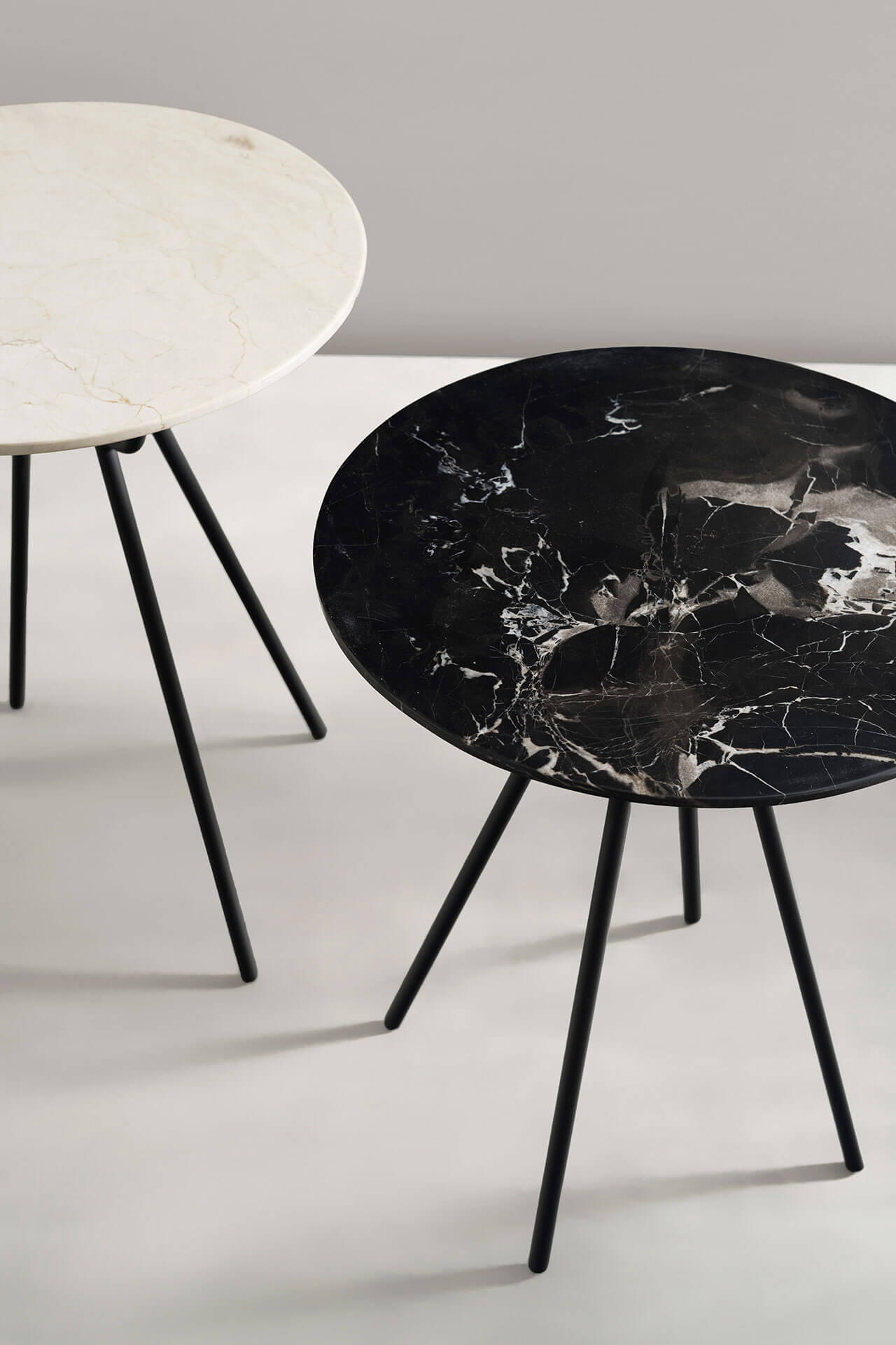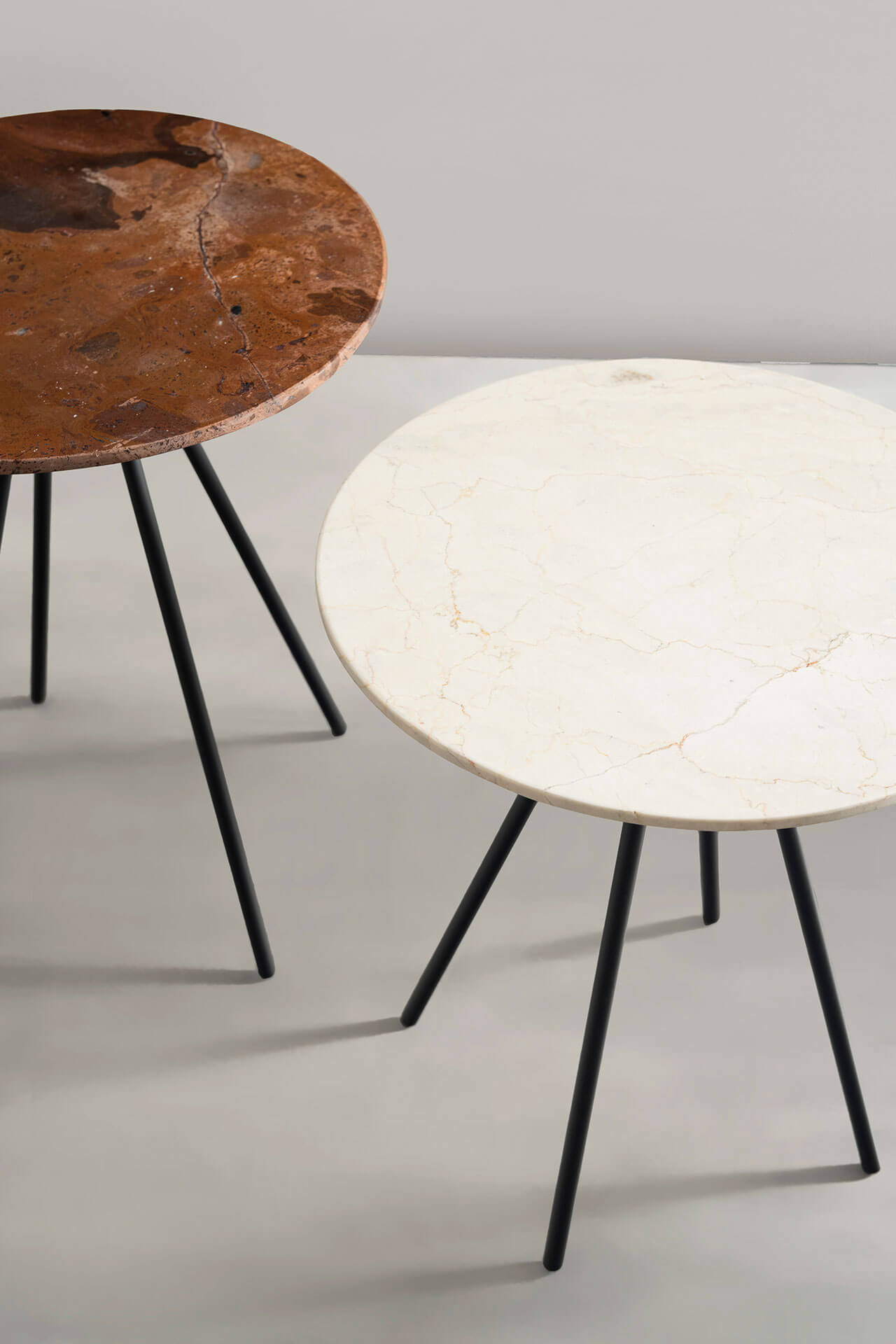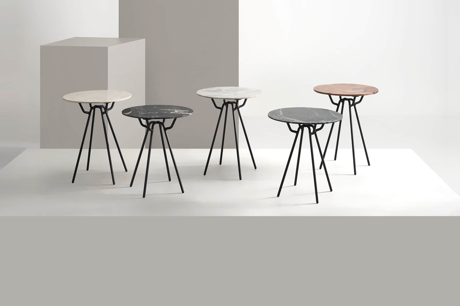 Pés em aço carbono sempre na cor preta, e tampos em mármore de diversas cores.