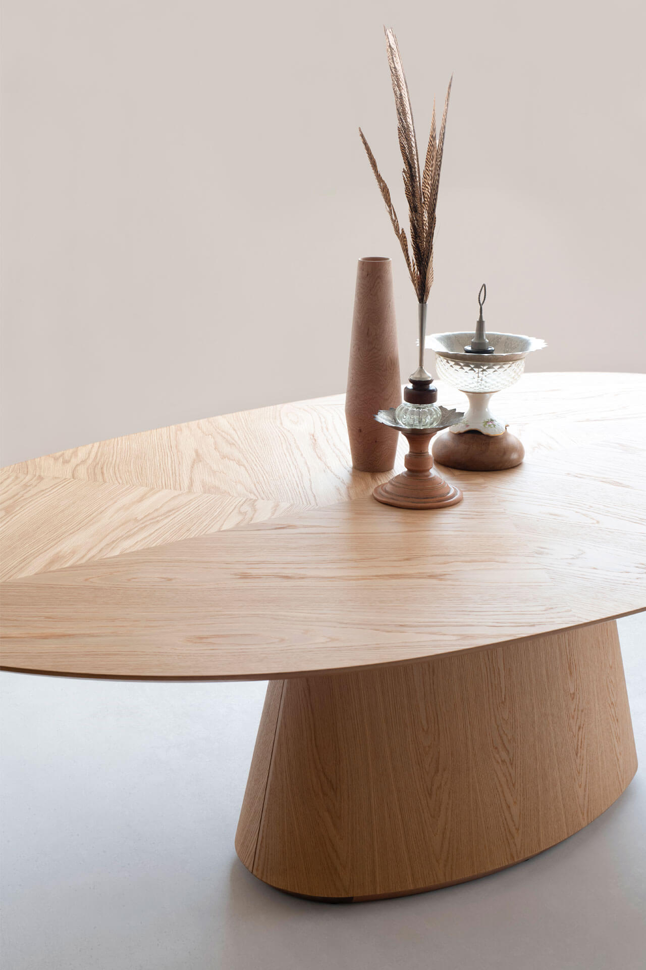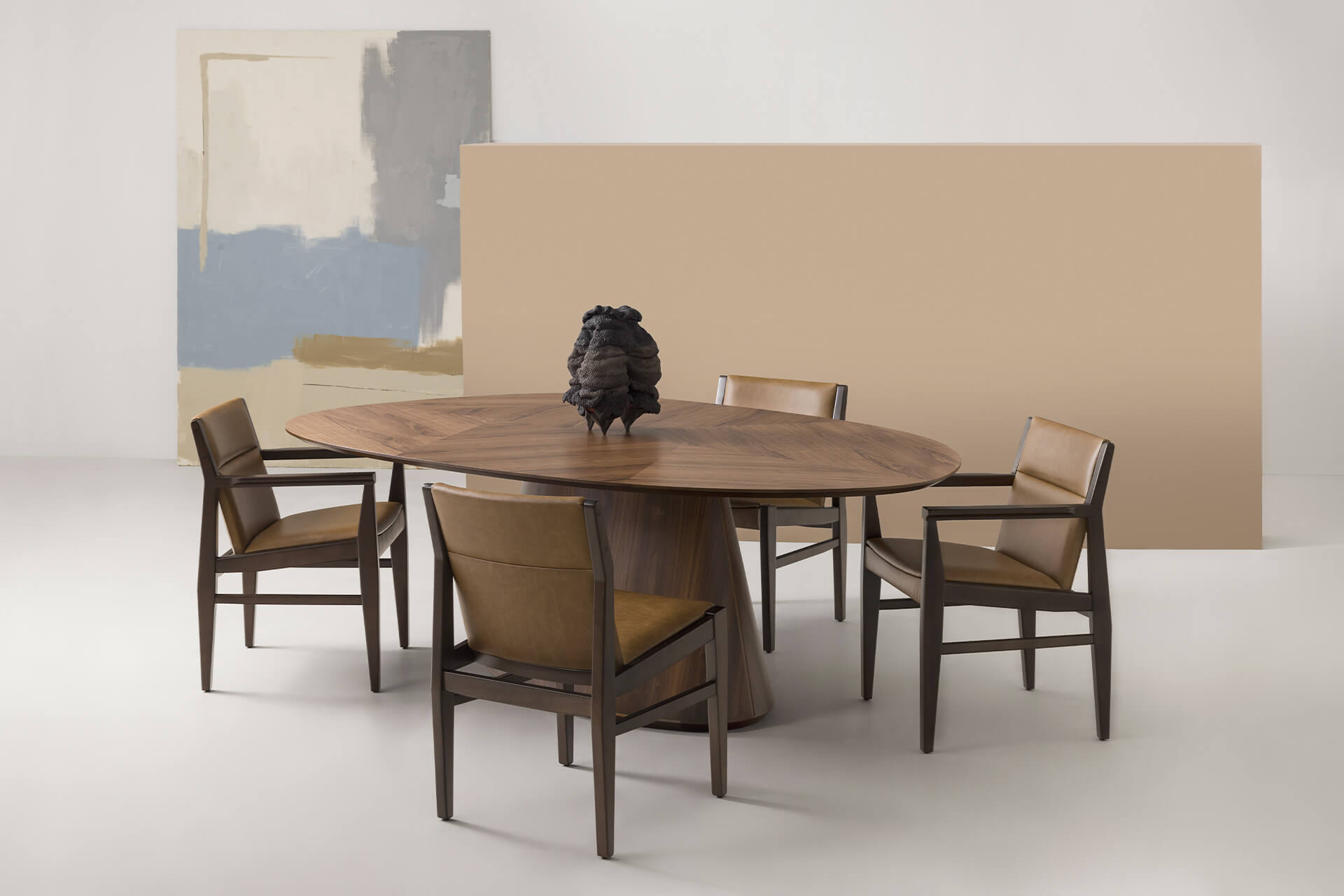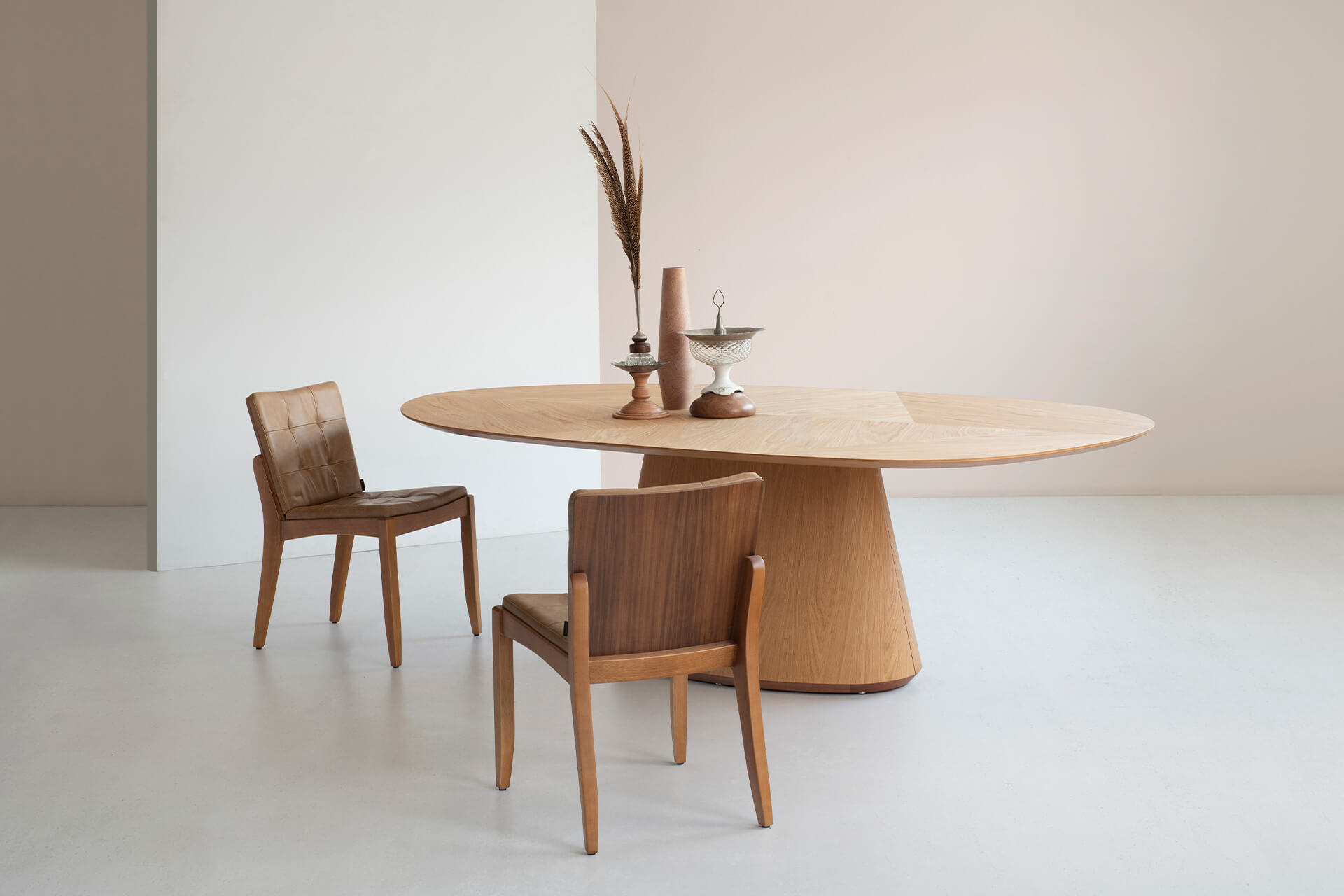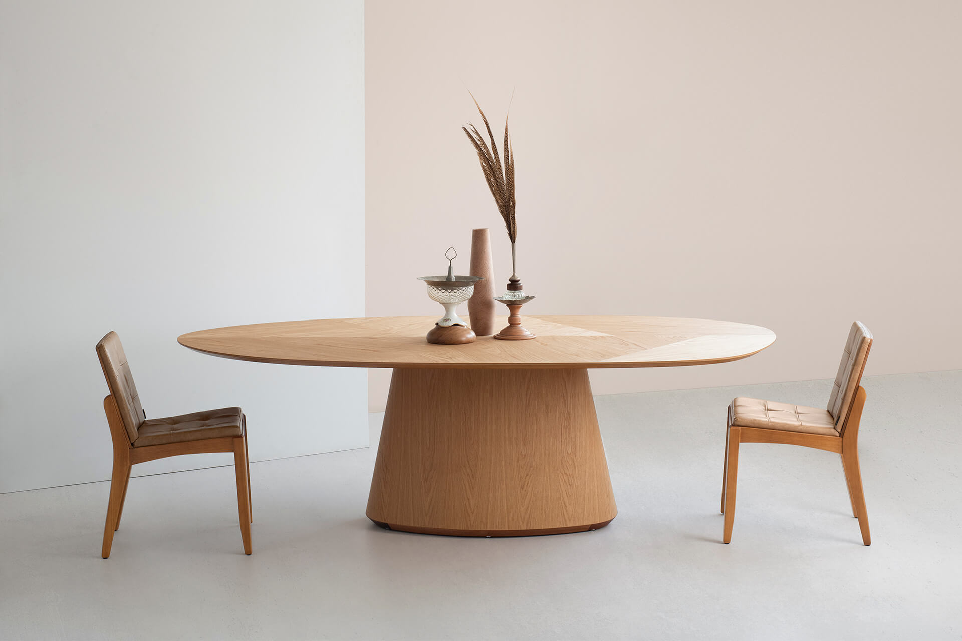 A mesa de jantar Lótus tem proporções generosas que permitem mais liberdade e fluidez na composição e posicionamento das cadeiras. Toda feita em lâmina de madeira natural, seu tampo de marchetaria (técnica de marcenaria artesanal tradicional) exibe desenhos irregulares que conversam com toda a proposta da peça. A Mesa Lótus é perfeita para quem busca uma peça com presença.