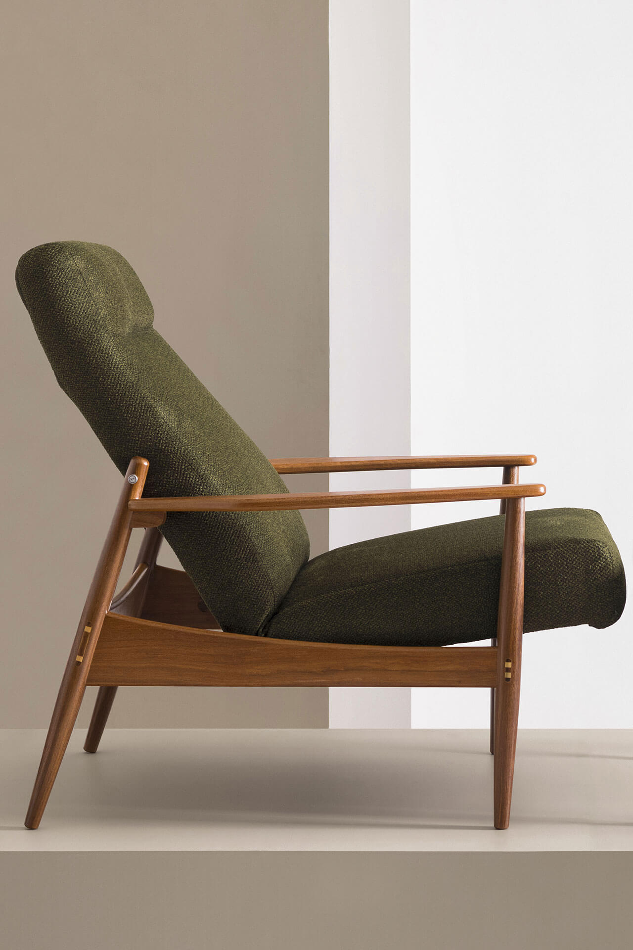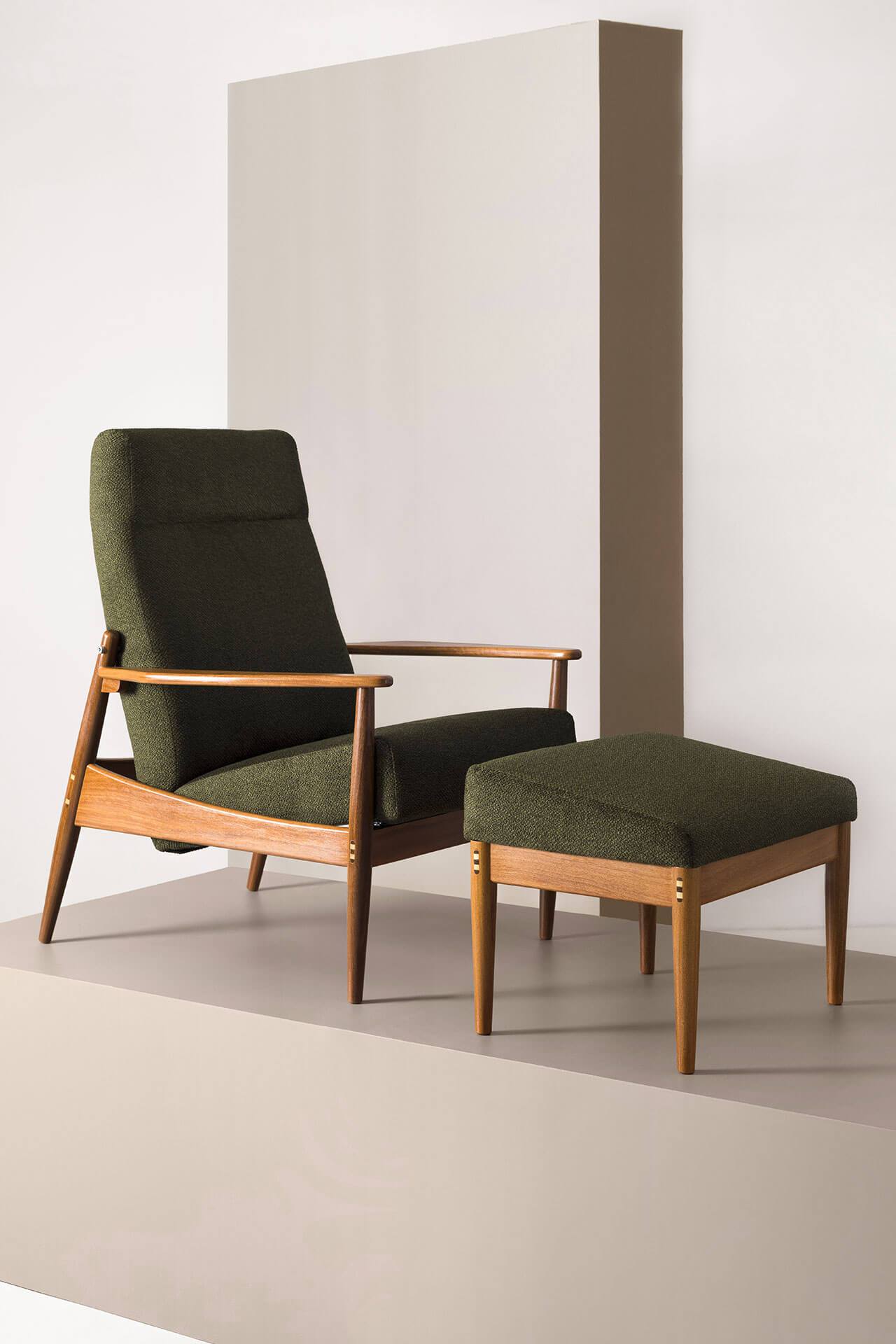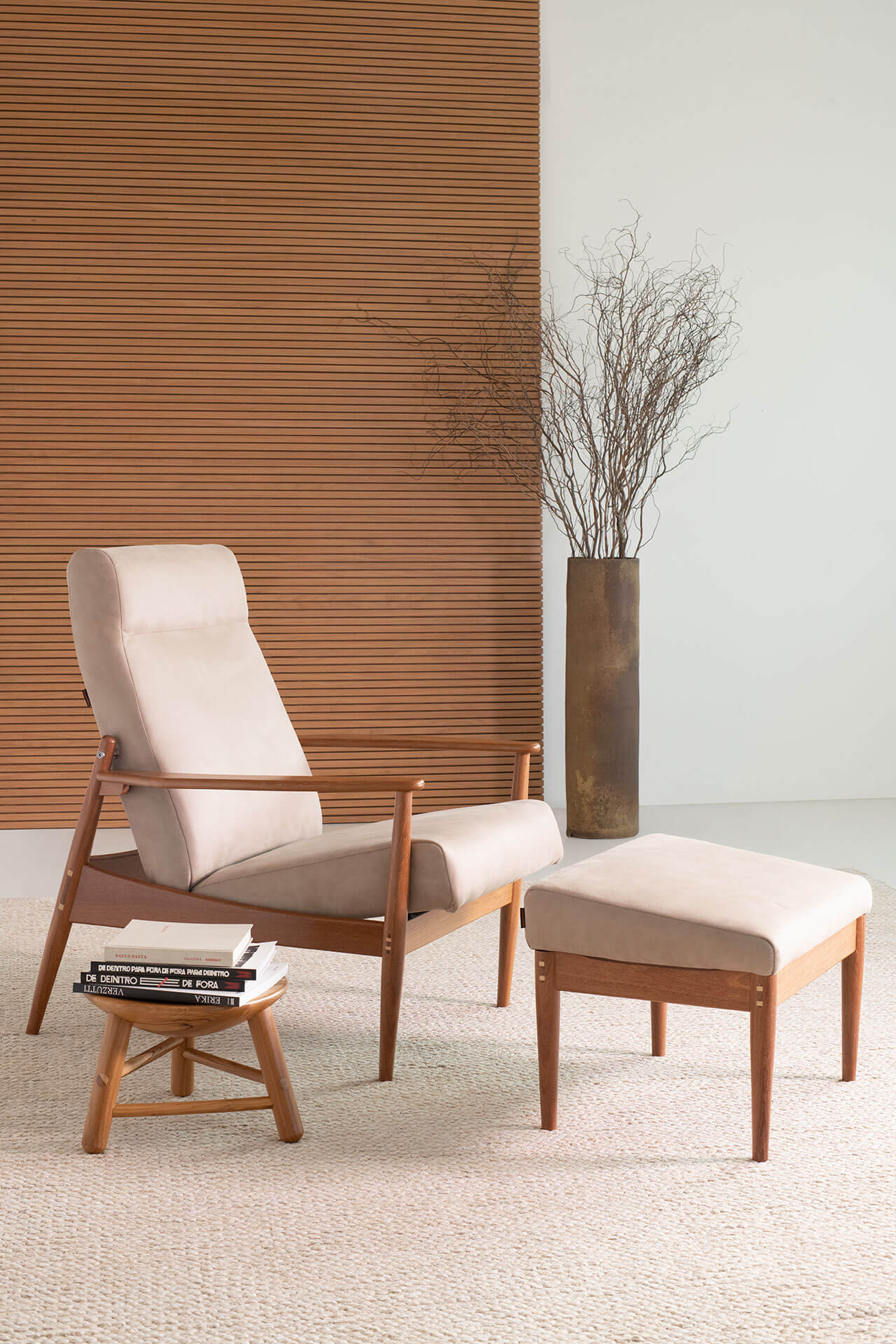 A Copacabana é uma poltrona aconchegante, reclinável, com assento e encosto estofados. A estrutura de madeira maciça traz encaixes aparentes que destacam todo o seu design. A peça, que pode ser feita em diversos tipos de revestimentos, tem um puff (opcional) para apoio dos pés.