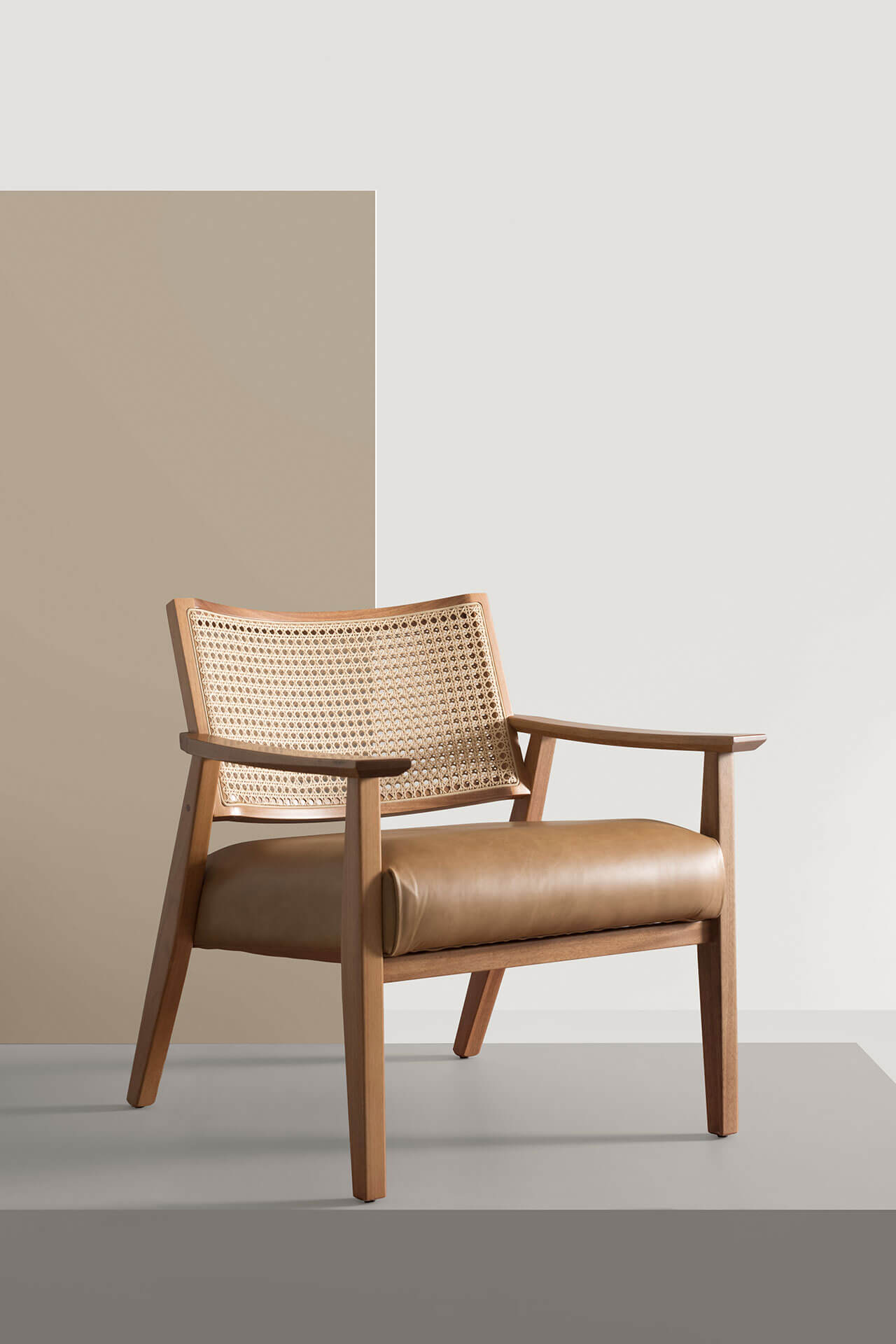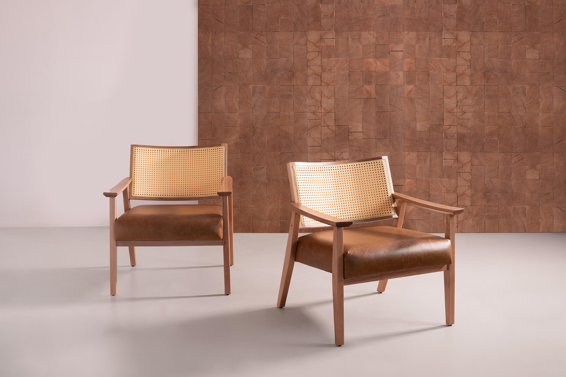 A Poltrona Giulia tem estrutura compacta e muito sofisticada, toda feita de madeira maciça e encosto de palhinha dupla. Seus chanfros asseguram a leveza necessária ao desenho. O assento da peça pode ser estofado em tecido ou couro natural.