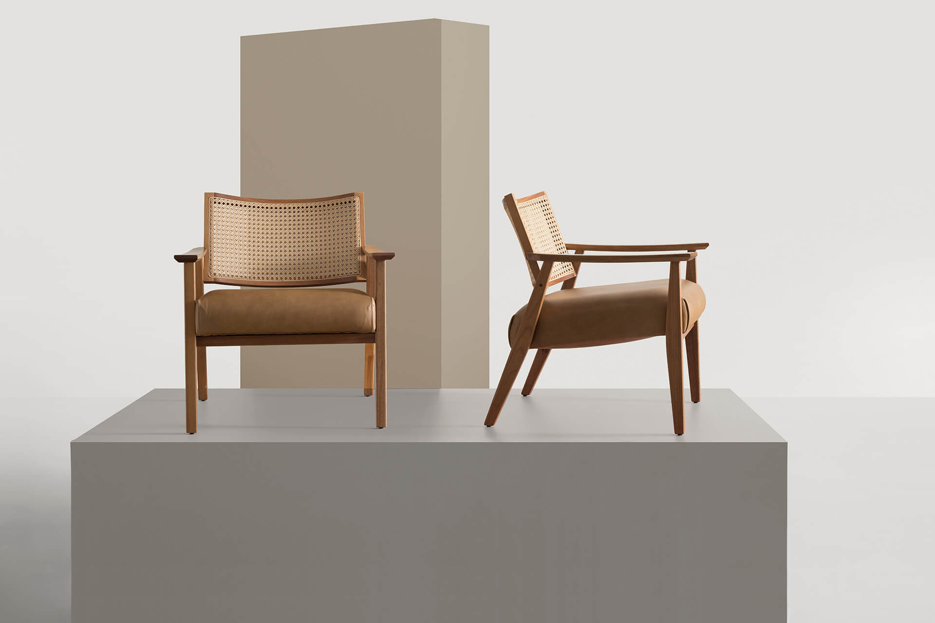 A Poltrona Giulia tem estrutura compacta e muito sofisticada, toda feita de madeira maciça e encosto de palhinha dupla. Seus chanfros asseguram a leveza necessária ao desenho. O assento da peça pode ser estofado em tecido ou couro natural.