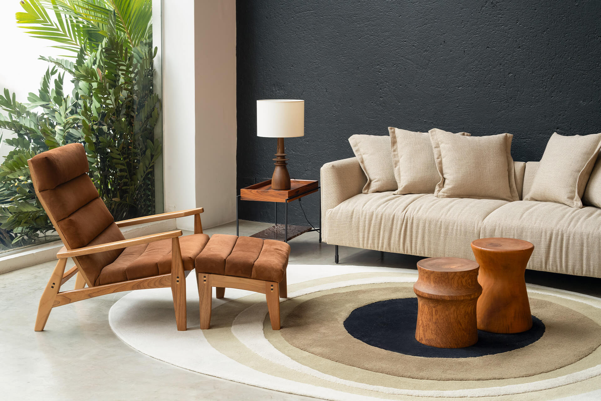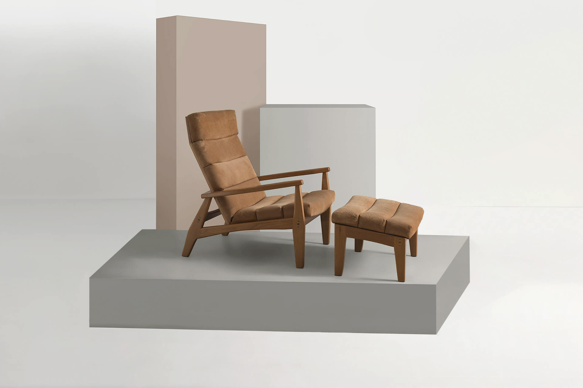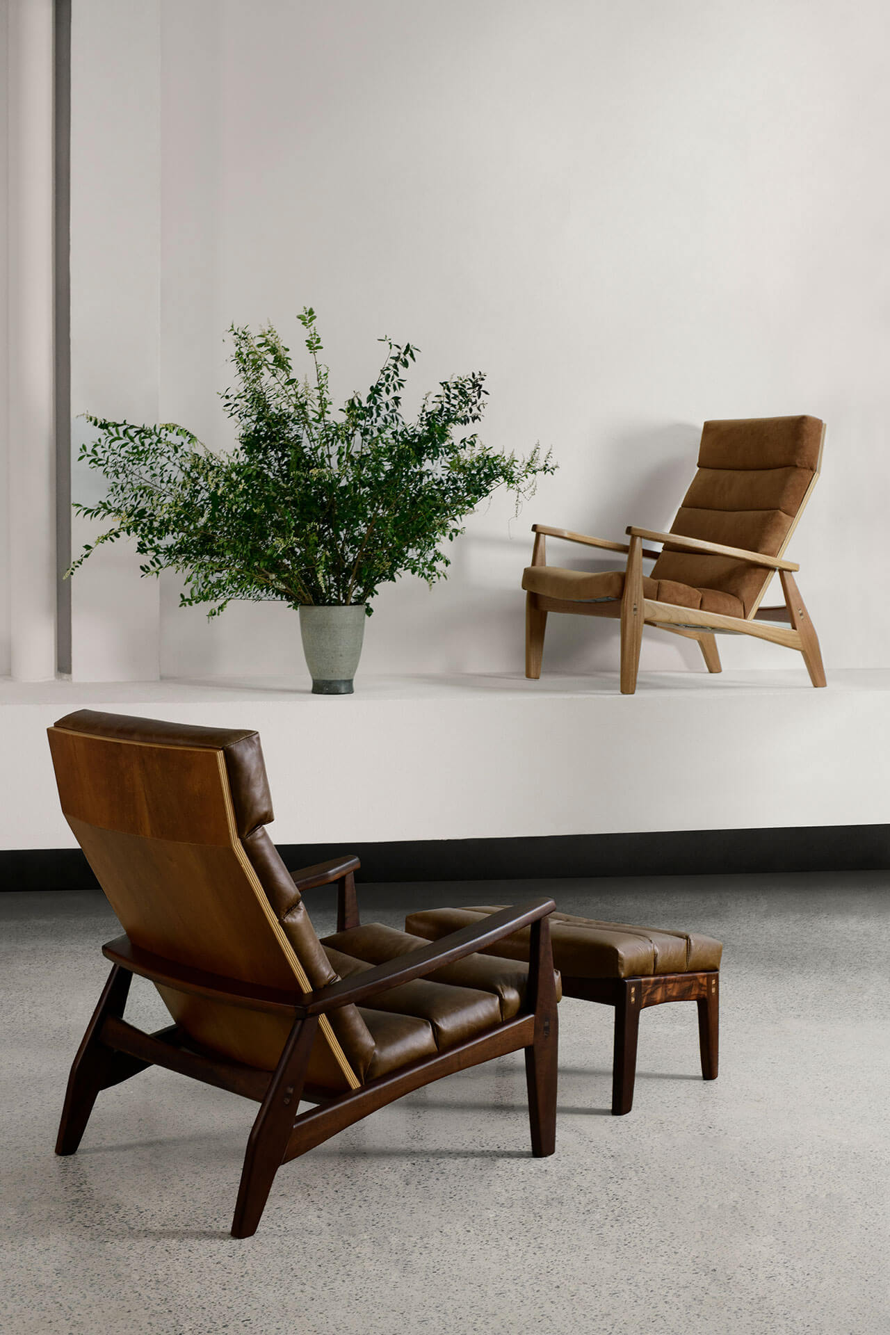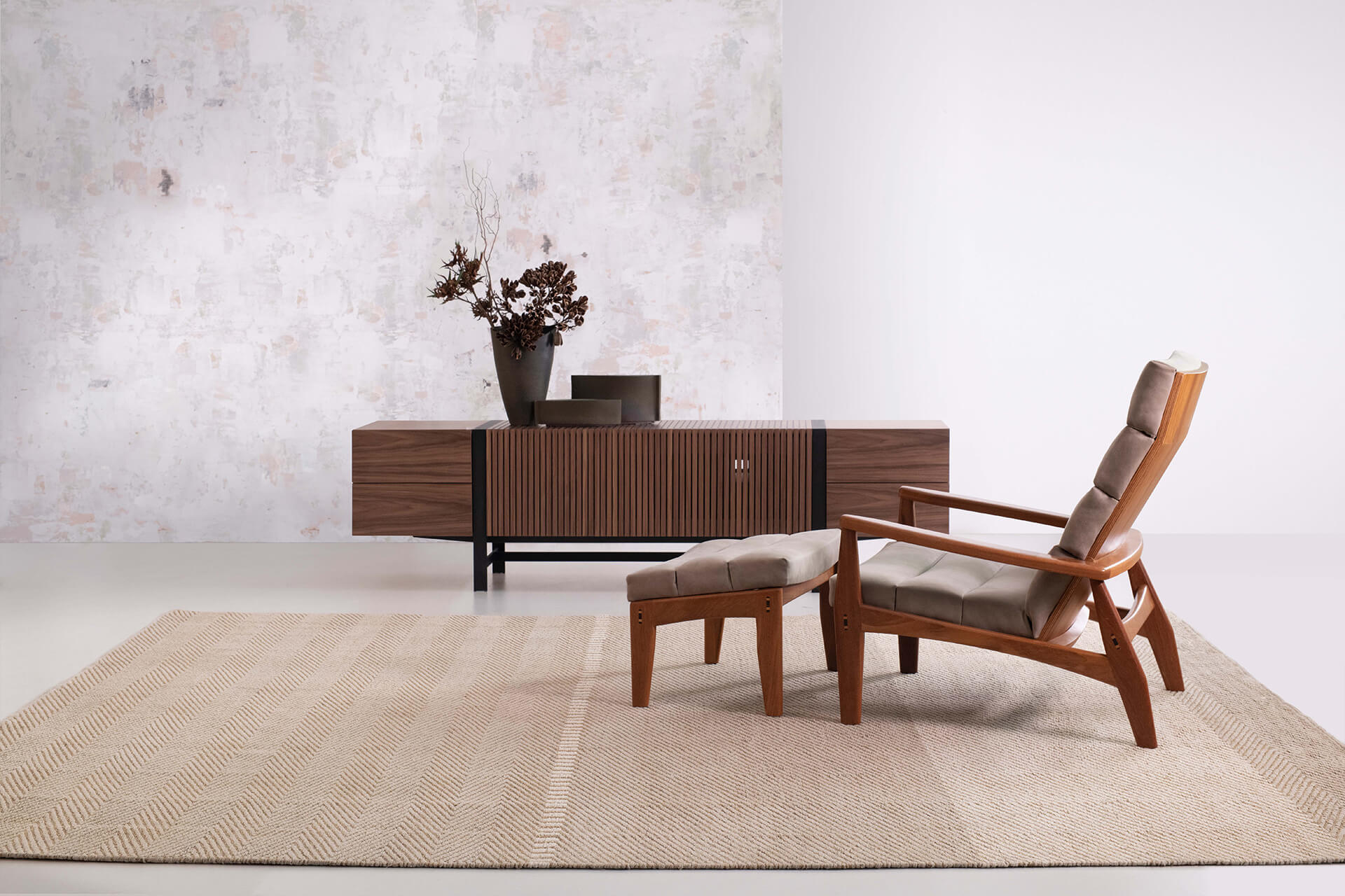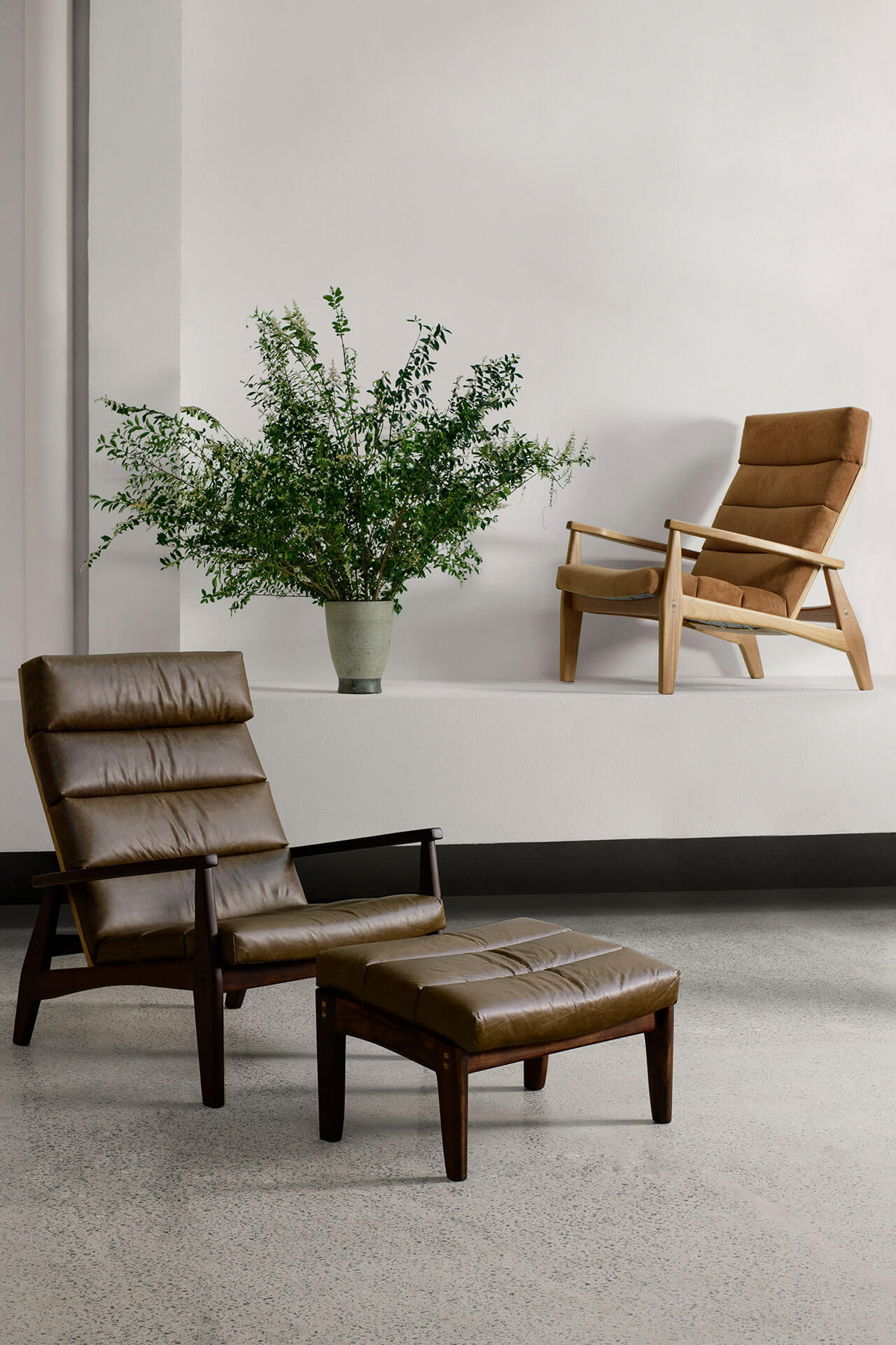 A poltrona Theo valoriza o uso da madeira maciça, presente em toda sua estrutura, braços e pés. O assento e encosto estofados fazem uma combinação perfeita com o couro natural, existindo a possibilidade de ser feita em outros tipos de estofamento.